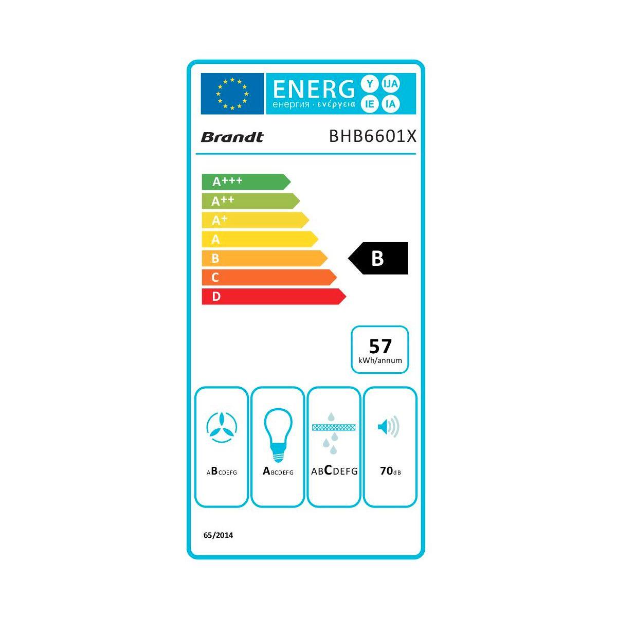 Type de hotte : Hotte murale Variateur de puissance : Non concerné Niveau sonore maximum : de 61 à 70 dB (légèrement bruyant) Consommation annuelle d'énergie en kWh : 57