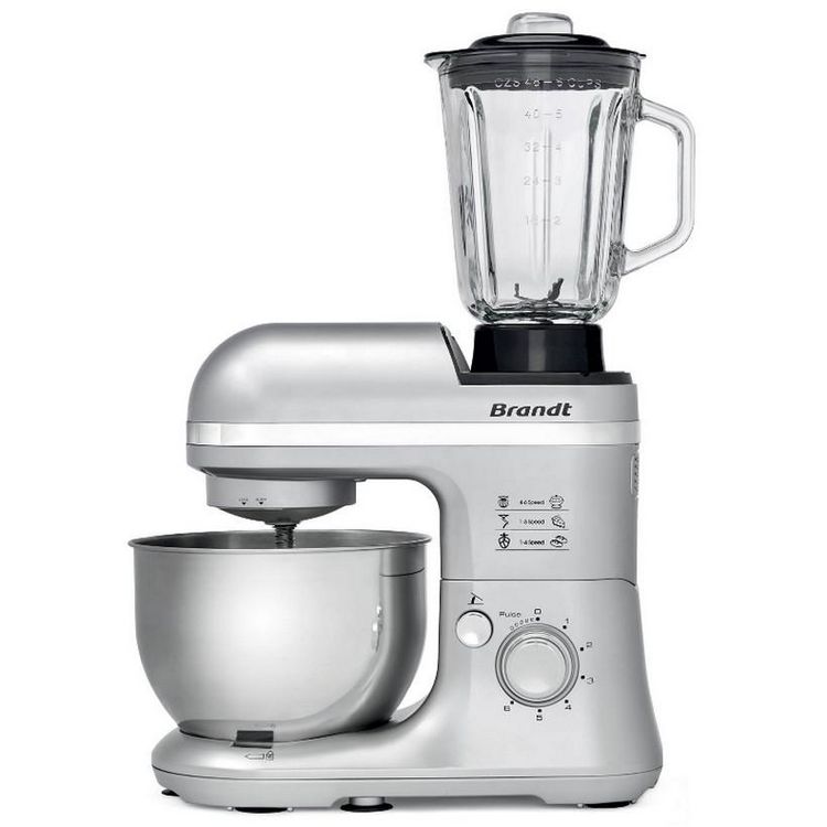 Brandt KM650BS Ce robot pâtissier multifonction Brandt KM650BS vous permet de réaliser de délicieux smoothies, soupes et veloutés. Fouet, batteur, pétrin et blender pour réaliser toutes vos préparations à la perfection ! Ce robot pâtissier compact, fonctionnel et élégant trouvera facilement sa place