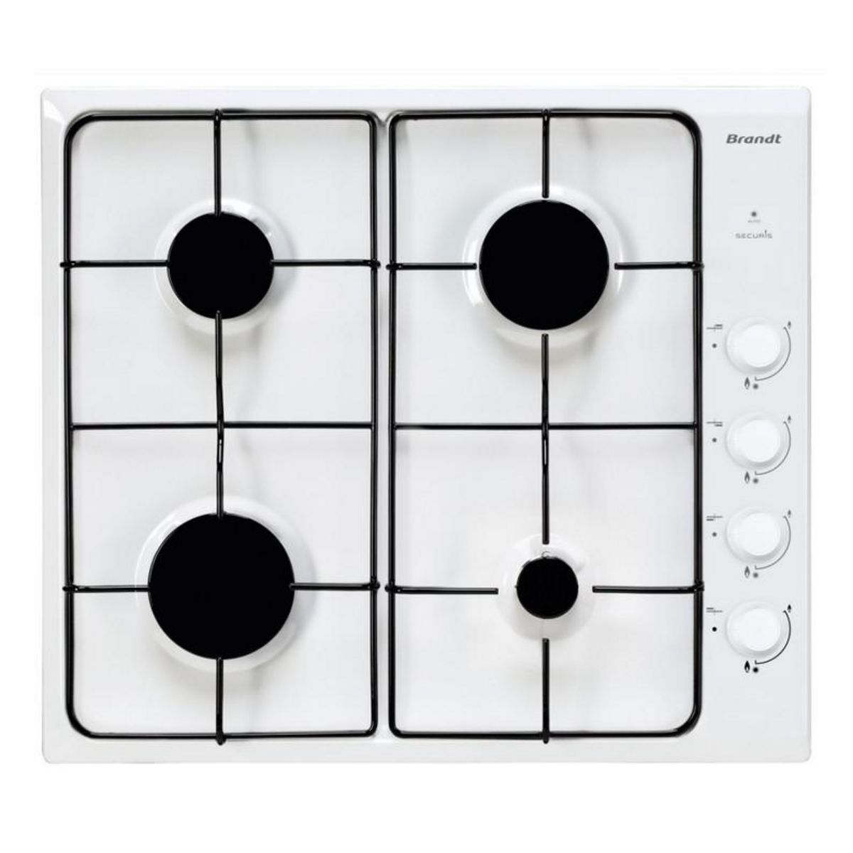 Brandt BPE6410W Table de cuisson à gaz BRANDT BPE6410W.Confort d'utilisationAvec l'allumage intégré aux manettes, un seul geste suffit pour allumer les foyers!Qualité de cuisson.Cette table est équipée de quatre puissances de foyer pour s'adapter à tous les styles de cuisson, notamment le plus petit