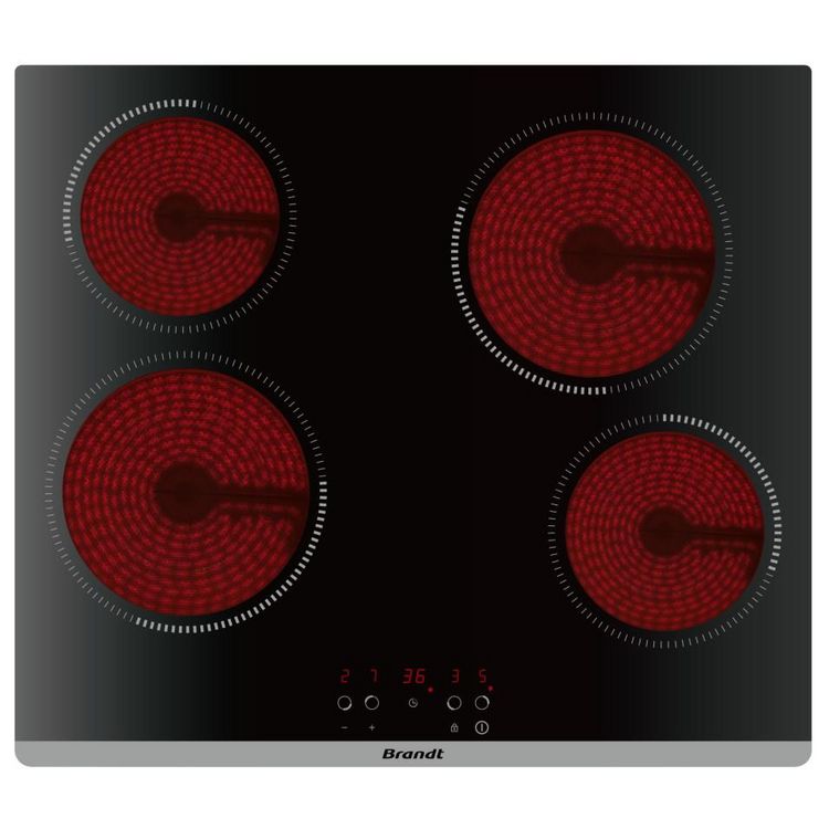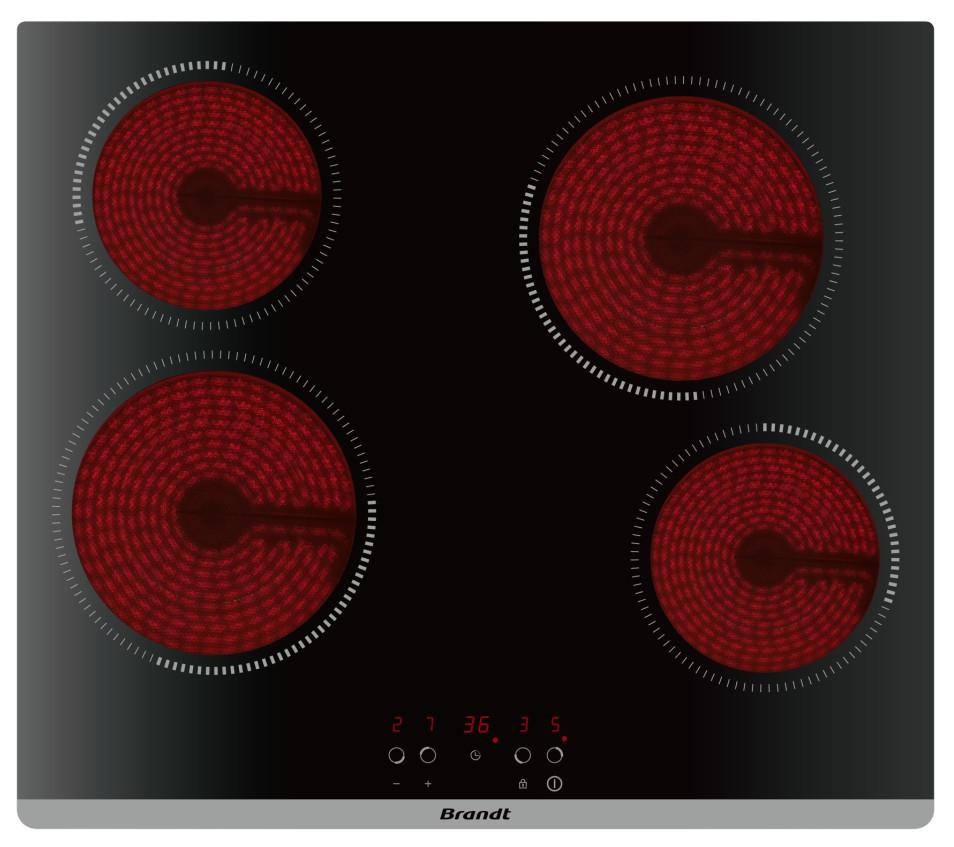 Brandt BPV6420B Table de cuisson vitrocéramique 60cm 4 feux 6000w noir Brandt BPV6420BManettes 9 positions du bandeau frontalVous cuisinez avec aisance en contrôlant parfaitement les préparations grâce aux 9 positions des manettes du bandeau frontal.Radiant quicklightRadiant Quicklight, un foyer pour tous les usages. Il est parfaitement adapté aux cuissons les plus vives comme aux cuissons grands volumes ou aux plats longuement mijotés.Témoins de chaleurDes témoins de chaleur résiduelle permettent d'utiliser la table en toute sécurité.