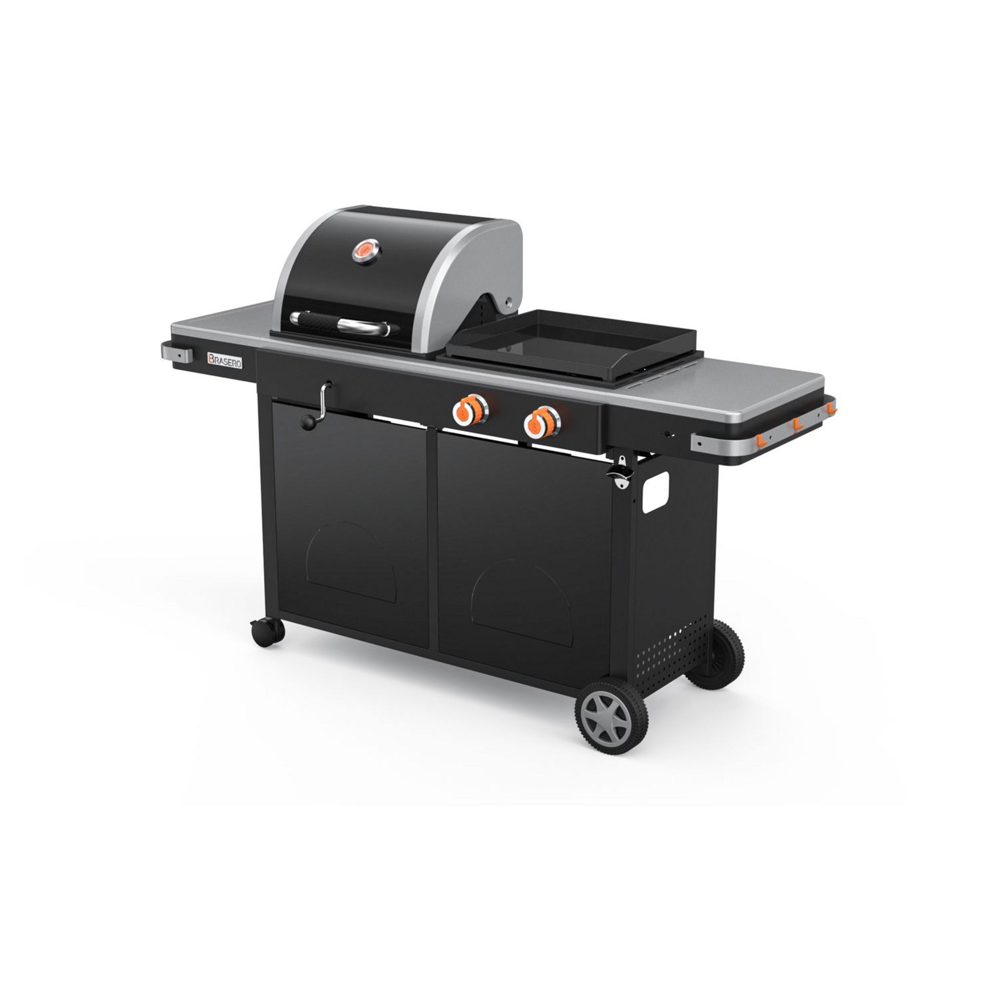 Plancha avec 2 brûleurs de 3,6 kW et barbecue au charbon de bois.Supports et tablettes de rangement. 4 roues dont 2 autobloquantes.