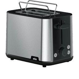 Le grille-pain Braun HT 1510 Purshine est un appareil de petit électroménager conçu pour rôtir parfaitement vos tranches de pain grâce à ses 8 niveaux de dorage et une puissance de 900 W. Son design moderne associe acier inoxydable et plastique noir, s'intégrant élégamment dans toute cuisine. Il dis