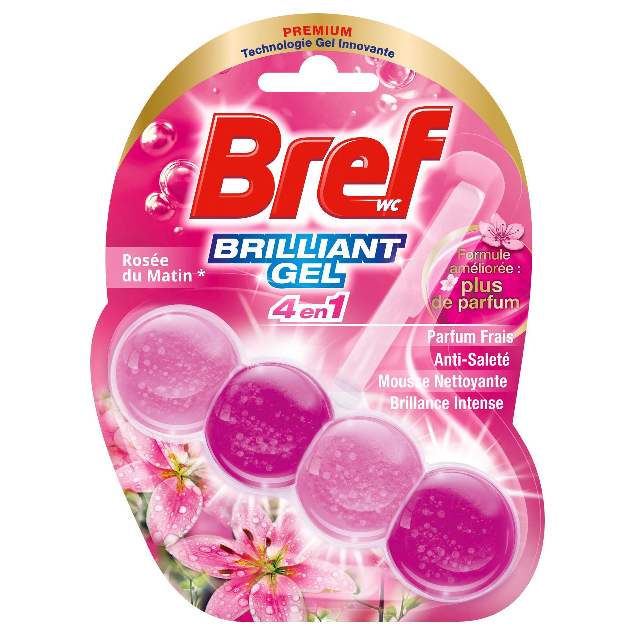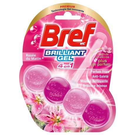 Bref WC est l'expert du nettoyage de vos toilettes en toute simplicité. Bref WC Brilliant Gel est le 1er bloc WC à la texture gel du marché ! Un design premium et élégant associé à une formule 4 en 1 qui apporte à vos toilettes une mousse nettoyante, une protection anti-saleté, un parfum frais* Rosée du Matin et une brillance intense. Bref WC Brilliant Gel dure jusqu'à 300 chasses : soit +20% comparé à nos gammes classiques, et vous garantit l'absence de résidus de produits entre les chasses. Bref WC Brilliant Gel, notre solution brillante pour vos toilettes ! *parfum de synthèse.