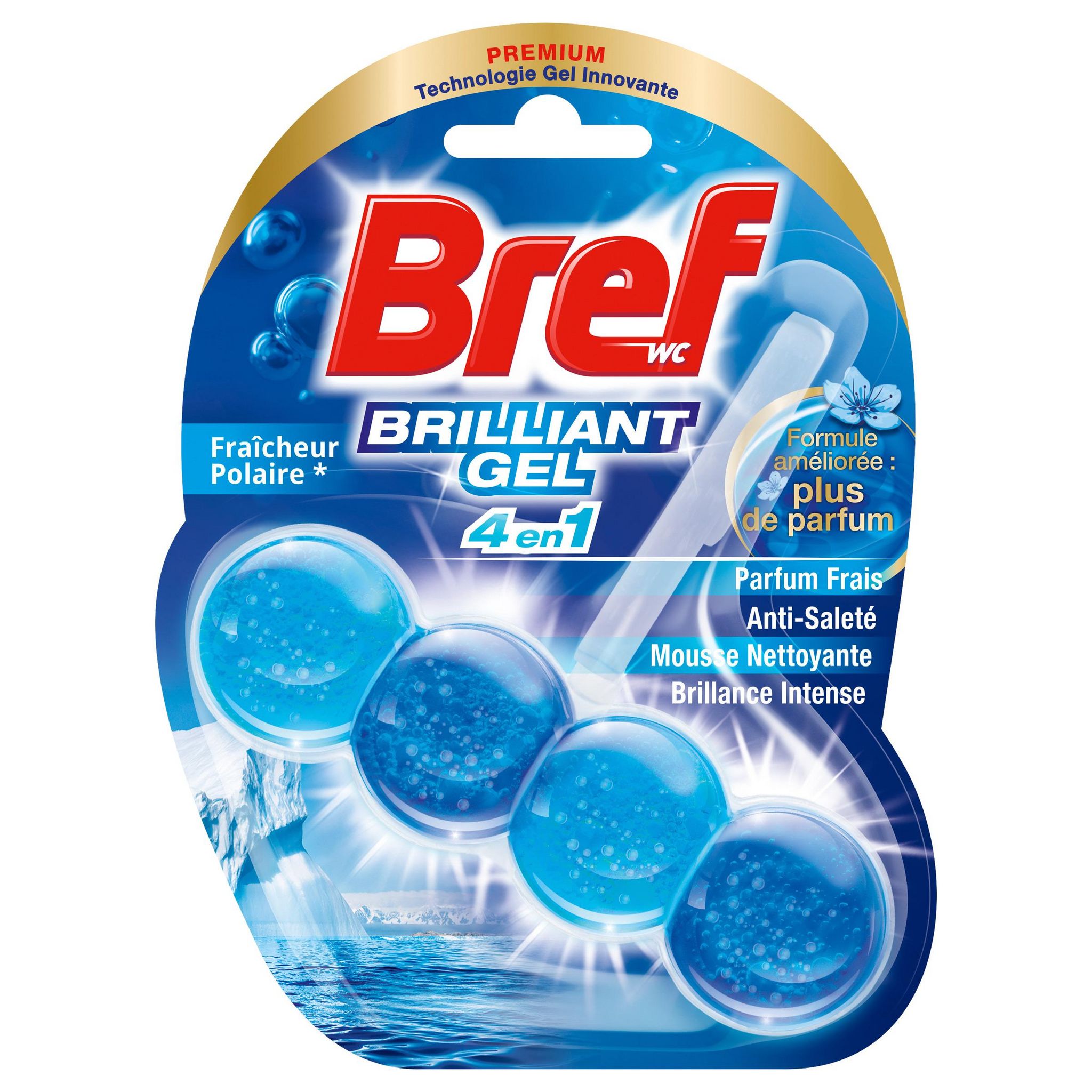 Bref WC est l'expert du nettoyage de vos toilettes en toute simplicité. Bref WC Brilliant Gel est le 1er bloc WC à la texture gel du marché ! Un design premium et élégant associé à une formule 4 en 1 qui apporte à vos toilettes une mousse nettoyante, une protection anti-saleté, un parfum frais* Fraîcheur Polaire et une brillance intense. Bref WC Brilliant Gel dure jusqu'à 300 chasses : soit +20% comparé à nos gammes classiques, et vous garantit l'absence de résidus de produits entre les chasses. Bref WC Brilliant Gel, notre solution brillante pour vos toilettes ! * Parfum de synthèse.
