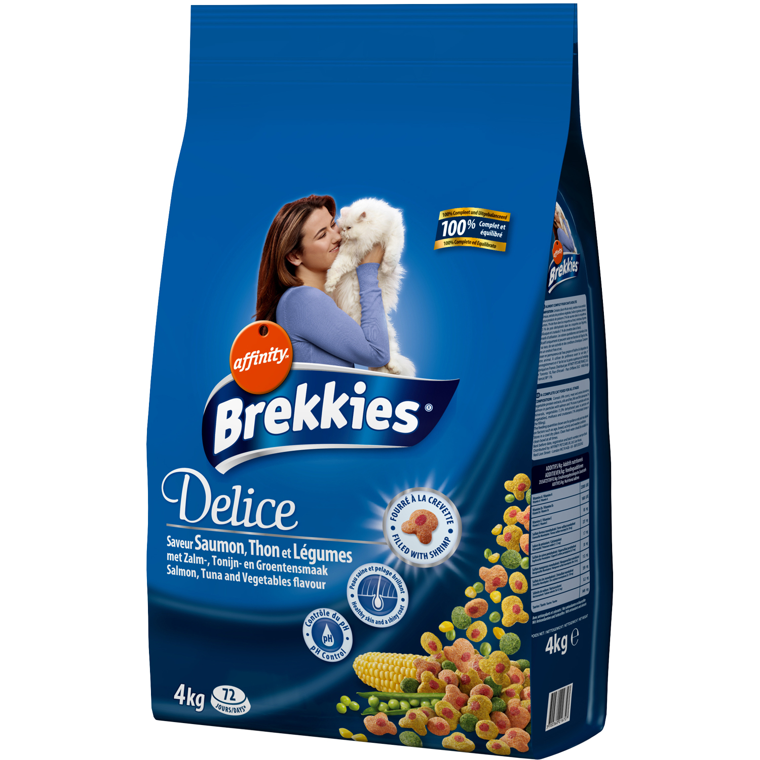 BREKKIES croquettes Chat Délice Poisson - 4 kgs Votre chat apprécie les aliments qui le surprennent par leur saveur et leur texture. Les excellentes croquettes variées de Delice au saumon et au thon marient un extérieur croquant et intérieur plus crémeux aux crevettes pour décupler le plaisir du chat. Chaque morceau se transforme en une expérience délicieuse et surprenante pour votre chat.