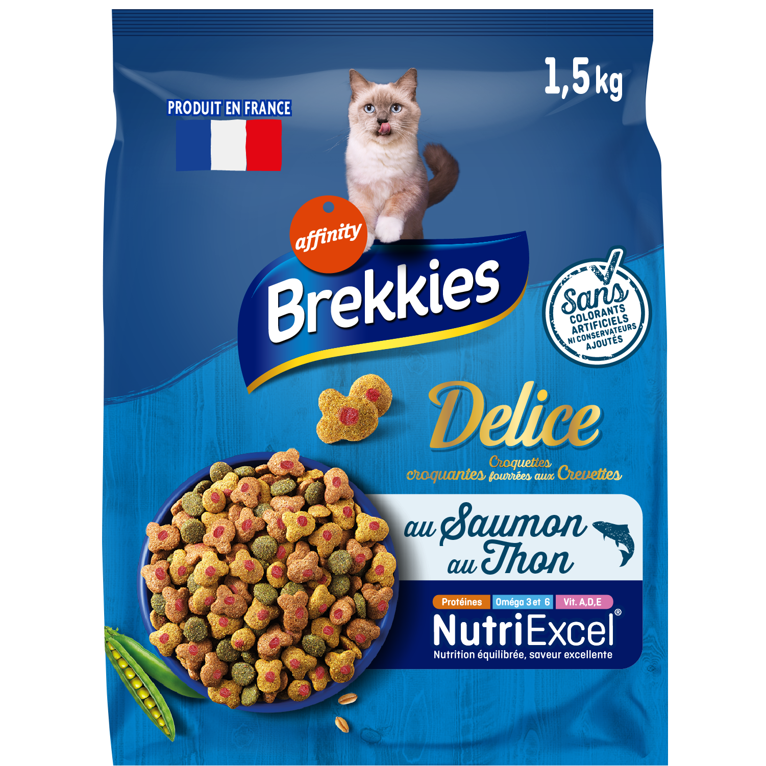 BREKKIES croquettes Chat Délice Poisson - 1,5 kgs Votre chat apprécie les aliments qui le surprennent par leur saveur et leur texture. Les excellentes croquettes variées de Delice au saumon et au thon marient un extérieur croquant et intérieur plus crémeux aux crevettes pour décupler le plaisir du chat. Chaque morceau se transforme en une expérience délicieuse et surprenante pour votre chat.