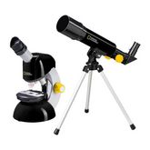 Lunette astronomique : Observation nocturne. Systeme optique : Réfracteur achromatique. Diametre de lentille : 50 mm. Distance focale : 360 mm Grossissement : 18x-29x. Monture : azimutale. Trépied de table Microscope : Explorer le microcosme. Lumiere transmise, éclairage LED. Grossissement : 40x-640