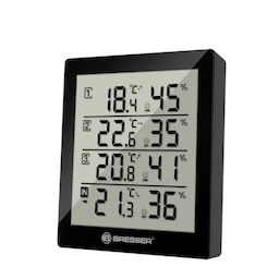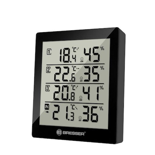 Le Bresser Temeo Hygro Quadro permet de mesurer la température et l'humidité de l'air à l'intérieur et autour de votre maison à 4 endroits différents. Cela permet une surveillance simple et centralisée : ma cave est-elle trop humide et menacée par la moisissure ? La chambre des enfants est-elle bien