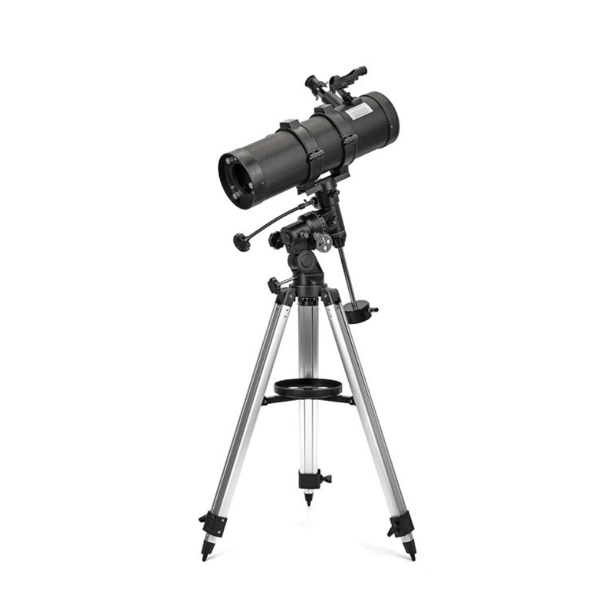 Grâce à l'adaptateur pour appareil photo pour smartphone inclus, vous pouvez prendre des photos de vos observations directement à travers l'oculaire du télescope. Caractéristiques: Télescope pour l'observation nocturne et solaire Système optique : Newtonien Puissance pratique maximale : 260x Diamètre de l'objectif : 130 mm Distance focale : 1000 mm Rapport d'ouverture : f/7,7 Monture : Équatoriale EQ-3 Diamètre de l'oculaire : 31,7 mm (1,25 ) Le kit comprend : Télescope Filtre solaire à ouverture Oculaires : 4 mm, 20 mm Viseur LED Lentille de Barlow 3x (à utiliser uniquement avec un oculaire de 20 mm) Adaptateur d'appareil photo pour smartphone Trépied en aluminium Plateau d'accessoires Logiciel