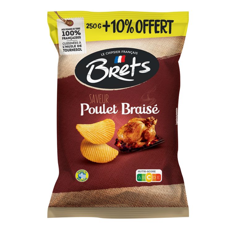 Chips de pommes de terre ondulées saveur poulet braisé Notre bestseller au goût inimitable de poulet rôti du week-end ! Bret's, la qualité en toute simplicité : Des pommes de terre françaises, une cuisson à l'huile de tournesol, une pincée de sel, des goûts justes et authentiques et c'est tout ! / Bret's : un engagement citoyen. Nous sommes une entreprise familiale impliquée dans le développement économique de notre région. / Merci à nos agriculteurs : 200 agriculteurs bretons s'engagent avec Bret's pour la qualité de nos pommes de terre et la réduction des traitements dans les champs. / Bret's préserve l'environnement : Grâce à une gestion de l'eau et des approvisionnements locaux, nous agissons au quotidien pour améliorer notre bilan carbone. / Produit en Bretagne / Fabrication française