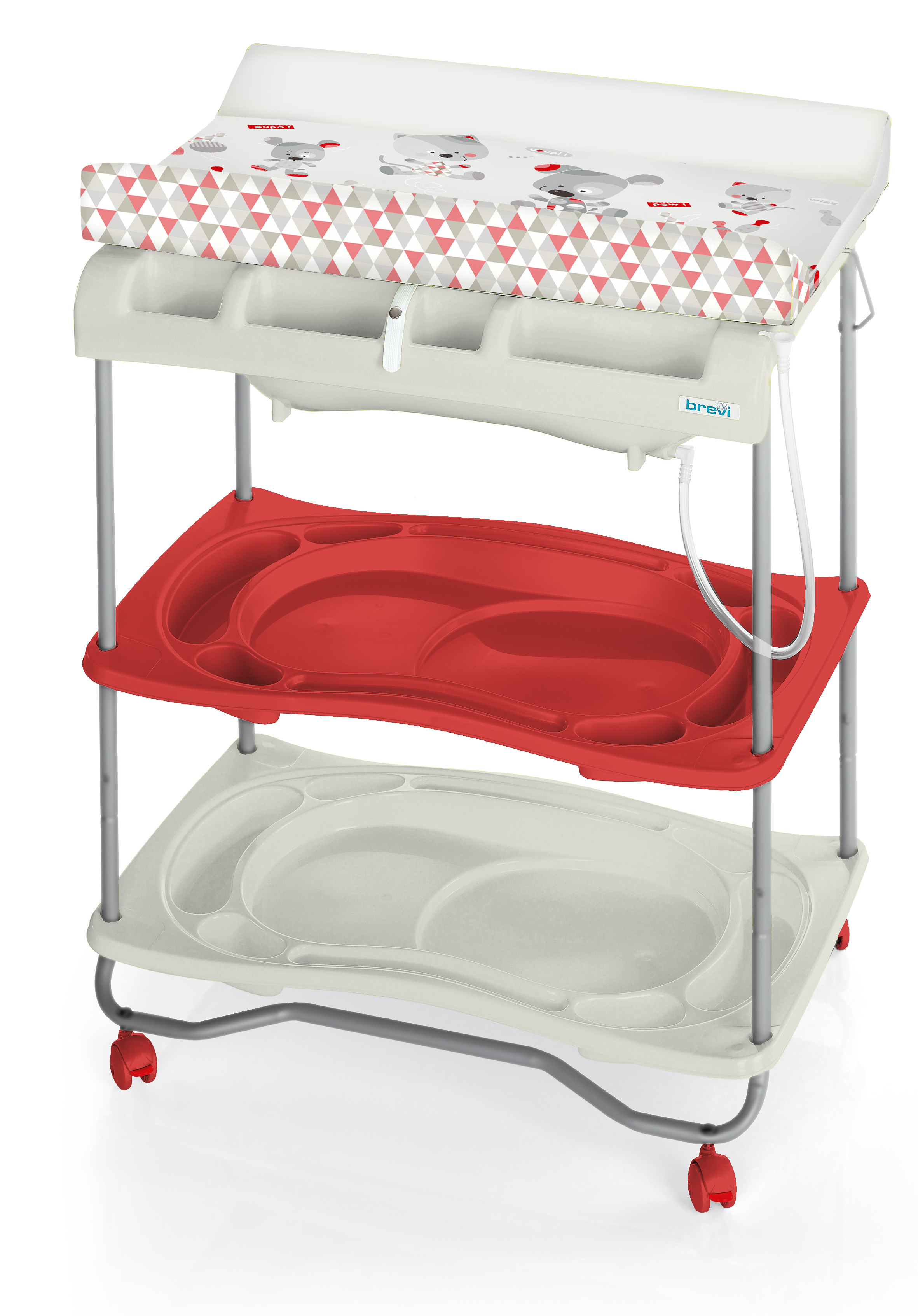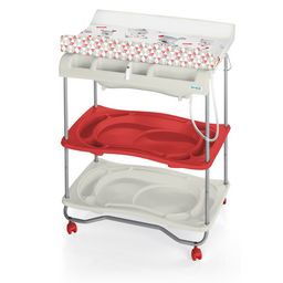 Table à langer avec baignoire intégrée. LE plan à langer bascule vers l'arrière pour laisser place à la baignoire. Deux étagères compartimentées pour ranger tout le nécessaire de la toilette de bébé. 4 compartiments principaux au niveau le plus haut. Quatre roulettes avec freins pour déplacer facilement la table.