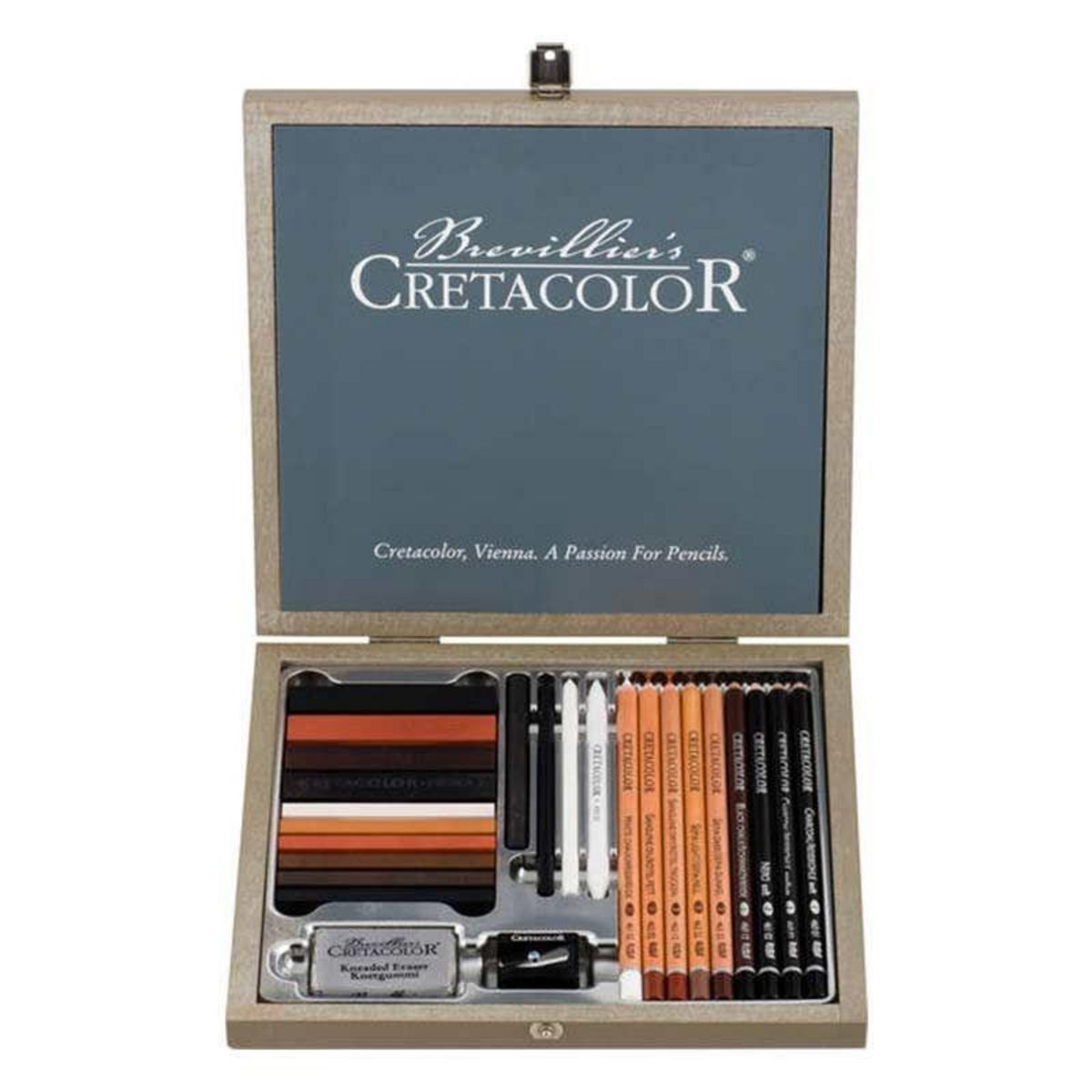 En savoir +Coffret Bois Passion boxCe coffret est idéal pour la réalisation de vos croquis, que vous soyez artiste professionnel ou amateur.Les 25 pièces complémentaires vous permettront de travailler dans l'approximation ou la précision, de varier les techniques.Contient : - Crayon fusain tendre/moyen, - Crayon Néro moyen, - Crayon craie noire moyen, - Crayon sépia clair/foncé,- Crayon sanguine gras/sec, - Crayon craie blanche moyen, - Mine artistes craie blanche moyen/noire moyen, - Craie pastel 7x7 mm blanche/ocre foncé/rouge ocre clair/Van Dyck brun/ombre/noir d'Ivoire, - Bâtonnets artistes large 7x14 mm, fusain / sanguine sec / sépia foncé sec / Néro extra doux, - Accessoires : estompe 7mm/gomme mie de pain/taille-crayon artiste