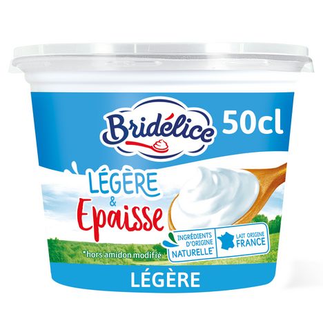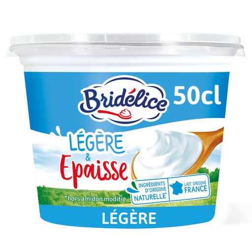 Ingrédients : Crème légère (97%) (LAIT) (origine France), amidon de tapioca modifié, ferments lactiques (LAIT). Ingrédients d'origine naturelle*. *hors amidon modifié