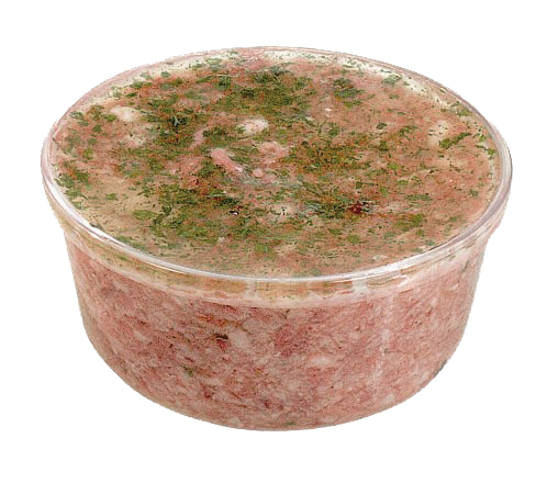 Ingrédients : Tête de porc (62%), eau, gélatine de porc, oignons, sel, dextrose, épices, poivre, ail, persil (0,02%), muscade, arômes