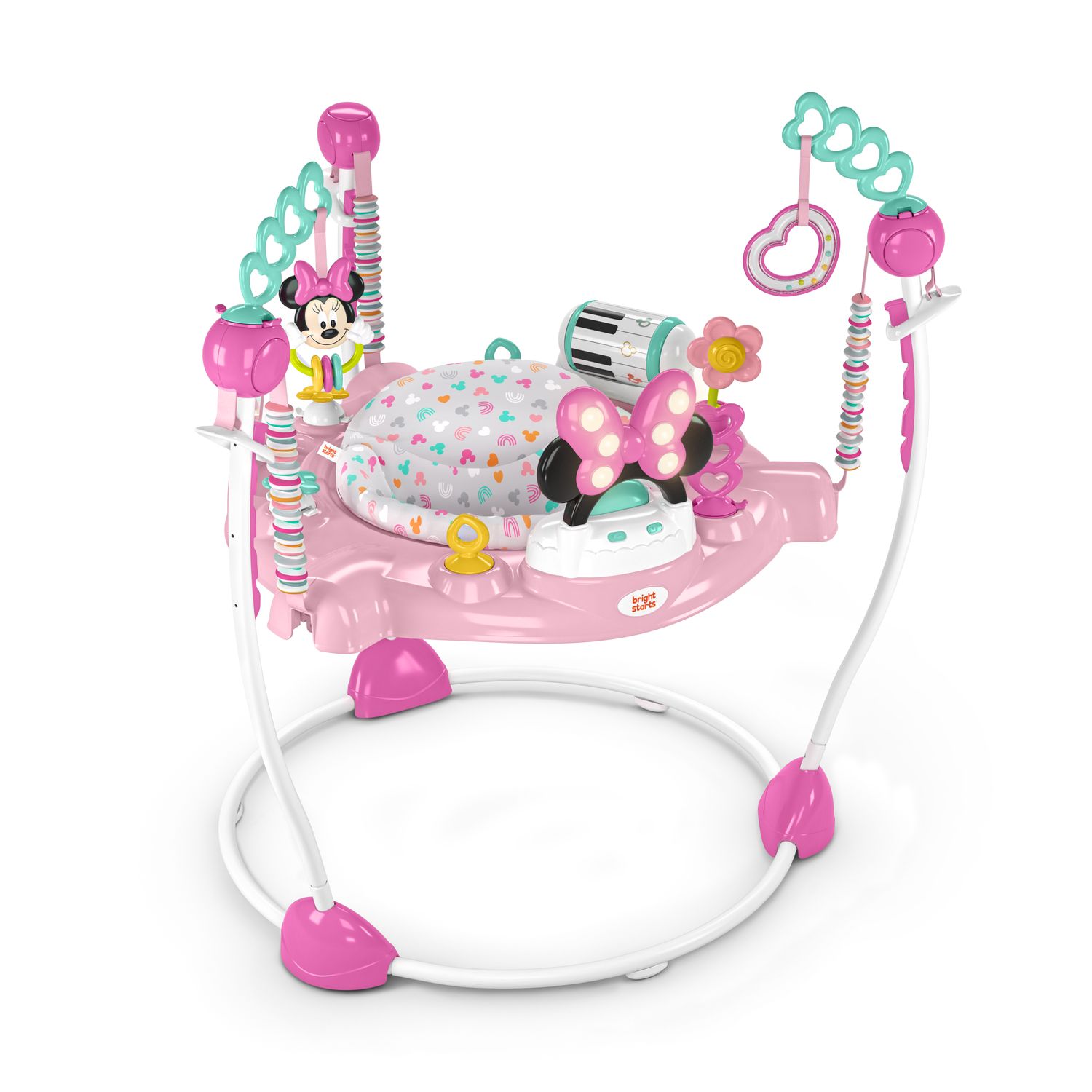 Sauteur Disney Baby Minnie Mouse de Bright Starts, avec 10 jouets amusants et activités : centre d'activités électroniques Minnie Mouse, un jouet Minnie accroché, un miroir en forme de cœur, un tambour avec des perles, une fleur qui tourne, un hochet cœur, un tambour avec carillons et une corde cœur pour attacher les jouets favoris de bébé., Siège pivotant à 360°, bébé attrape tous les jouets facilement; lumières et sons s'activant à chaque saut (2 options volume) idéal pour encourage le mouvement et découvrir le système cause effet; plus bébé saute plus il y a de bruit et de lumières !, Jouet évolutif; 4 hauteurs possibles; pour enfants de 6 mois et plus ou jusqu'à 11kgs maximum. Les petits pieds touchent le sol, en toute sécurité; dimensions totales 86.36 cm x 93.22 cm x 93.22 cm., Housse de siège nettoyage facile. Parties en plastique et métalliques - Nettoyer avec 1 linge humide et du savon doux. Séchage à l'air libre. Ne pas faire tremper., Ce sauteur et activités en rose est un cadeau parfait pour garçons ou filles. Pour fêtes prénatales, cadeau de Noel, et autres occasions; bébé et ses parents adorent ce jouet très amusant et entrainant.
