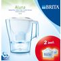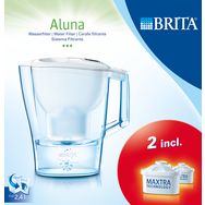 Carafe BRITA ALUNA avec 2 cartouches MAXTRA pour deux mois d'eau filtrée au goût agréable. Cette carafe filtre tartre, chlore et plomb. 1 cartouche = 100 litres = 4 semaines
