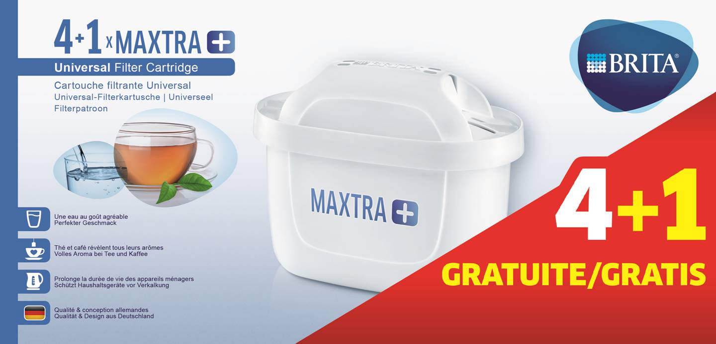 Pack de 4 +1 cartouche filtrante MAXTRA+ haute performance.Une eau au goût encore plus agréable grâce à la nouvelle technologie MAXTRA+ haute performance qui filtre tartre, chlore, plomb.Compatible avec votre carafe BRITA MAXTRA. 1 cartouche = 100L = 1 mois d'eau filtrée