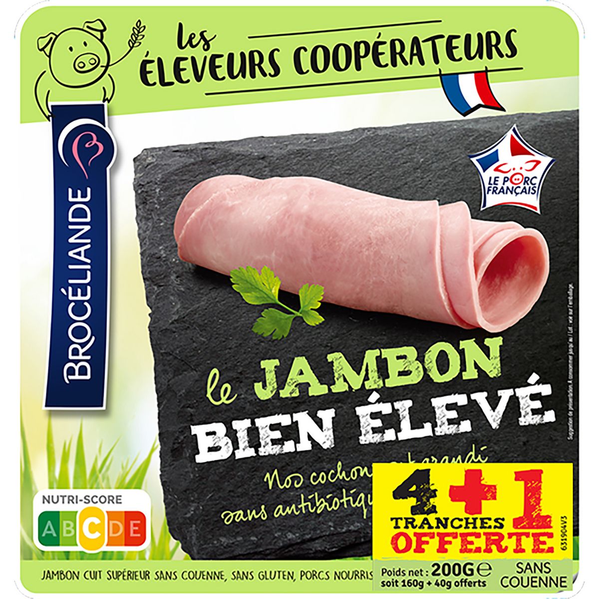 Jambon issu d'animaux élevés sans antibiotique dès la naissance et nourris sans OGM (< 0,9%).