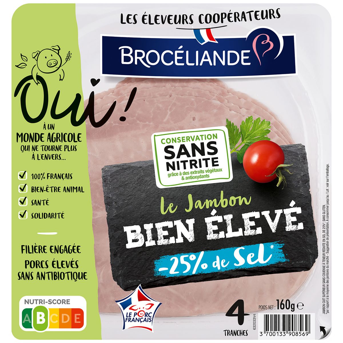 Le goût authentique et la texture du jambon Brocéliande élaboré à partir de viande de porcs français élevés sans antibiotique dès la naissance et nourris sans OGM (<0,9%) à teneur réduite en sel de 25% par rapport à la moyenne du marché