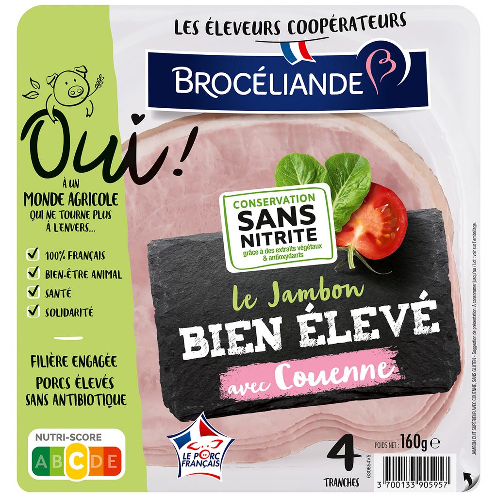 JAMBON CUIT SUPERIEUR AVEC COUENNE ISSU D’ANIMAUX ELEVES SANS ANTIBIOTIQUE DES LA NAISSANCE ET NOURRIS SANS OGM (<0.9%) Le jambon Bien Élevé Brocéliande avec couenne est élaboré à partir de viande de porcs élevés sans antibiotique dès la naissance et nourris sans OGM (<0.9%)