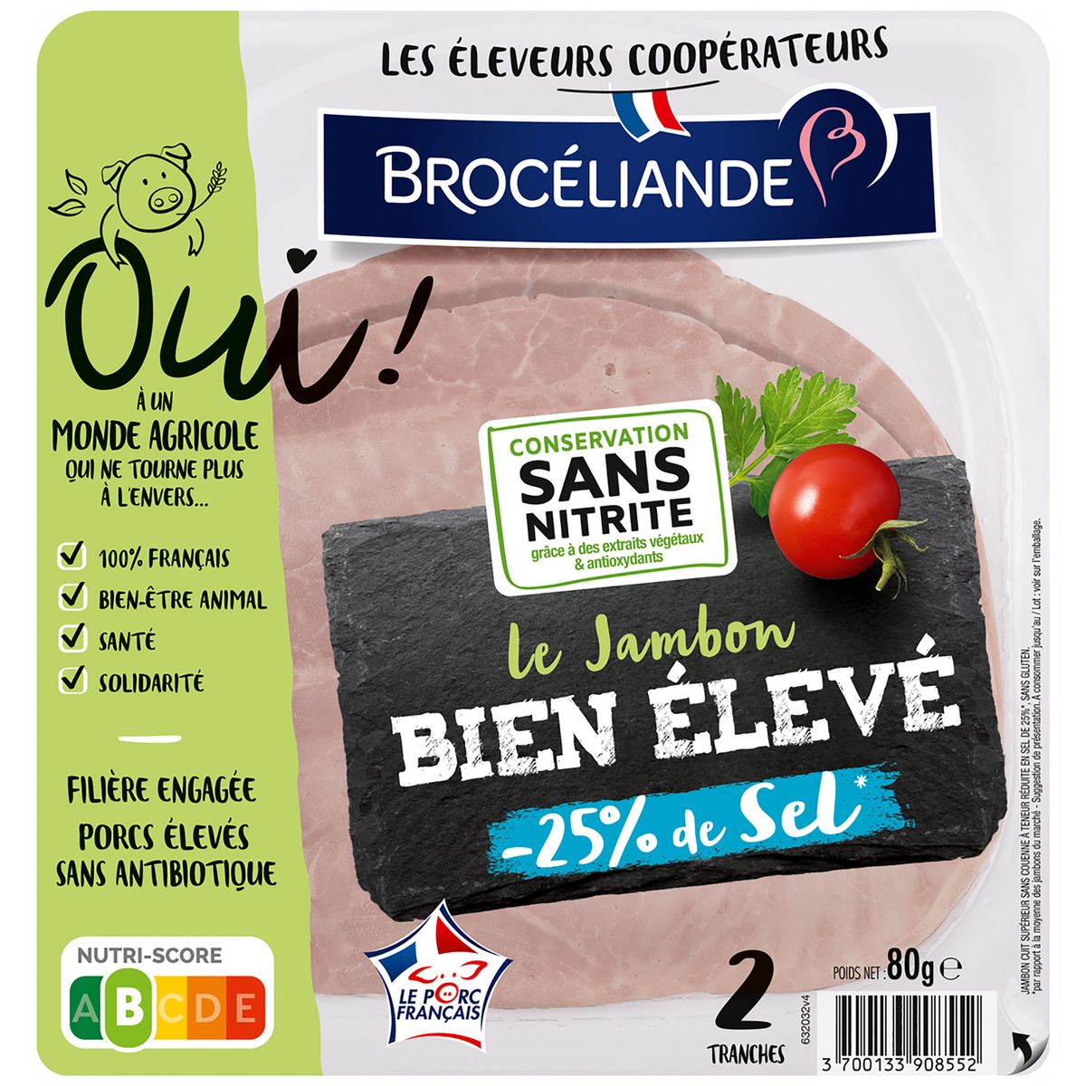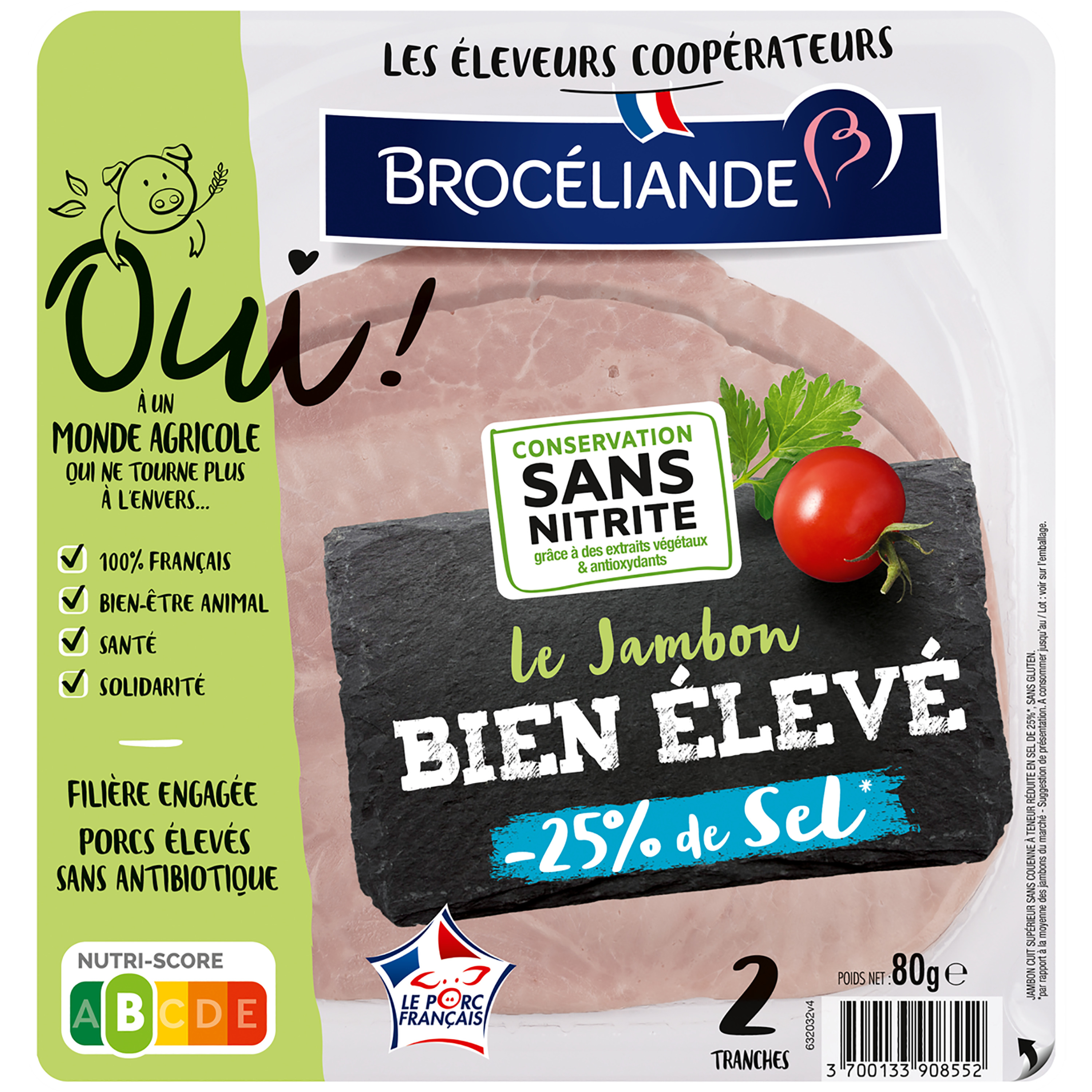 JAMBON CUIT SUPERIEUR DECOUENNE DEGRAISSE A TENEUR REDUITE EN SEL DE 25% ISSU D’ANIMAUX ELEVES SANS ANTIBIOTIQUE DES LA NAISSANCE ET NOURRIS SANS OGM (<0.9%) Jambon supérieur sans couenne à teneur réduite en sel de 25% par rapport à la moyenne du marché