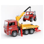 Dépanneuse MAN très réaliste avec le véhicule de cross-country par Bruder. Abaisse la plate-forme de chargement, étends et fais pivoter le châssis de levage. L'équipement de remorquage et le harnais de chargement sont inclus, ils sont constitués de chaînes et colliers de roues ce qui permet un remor