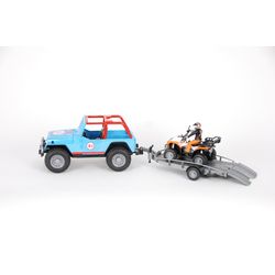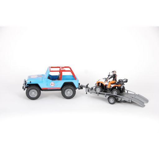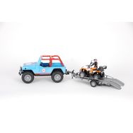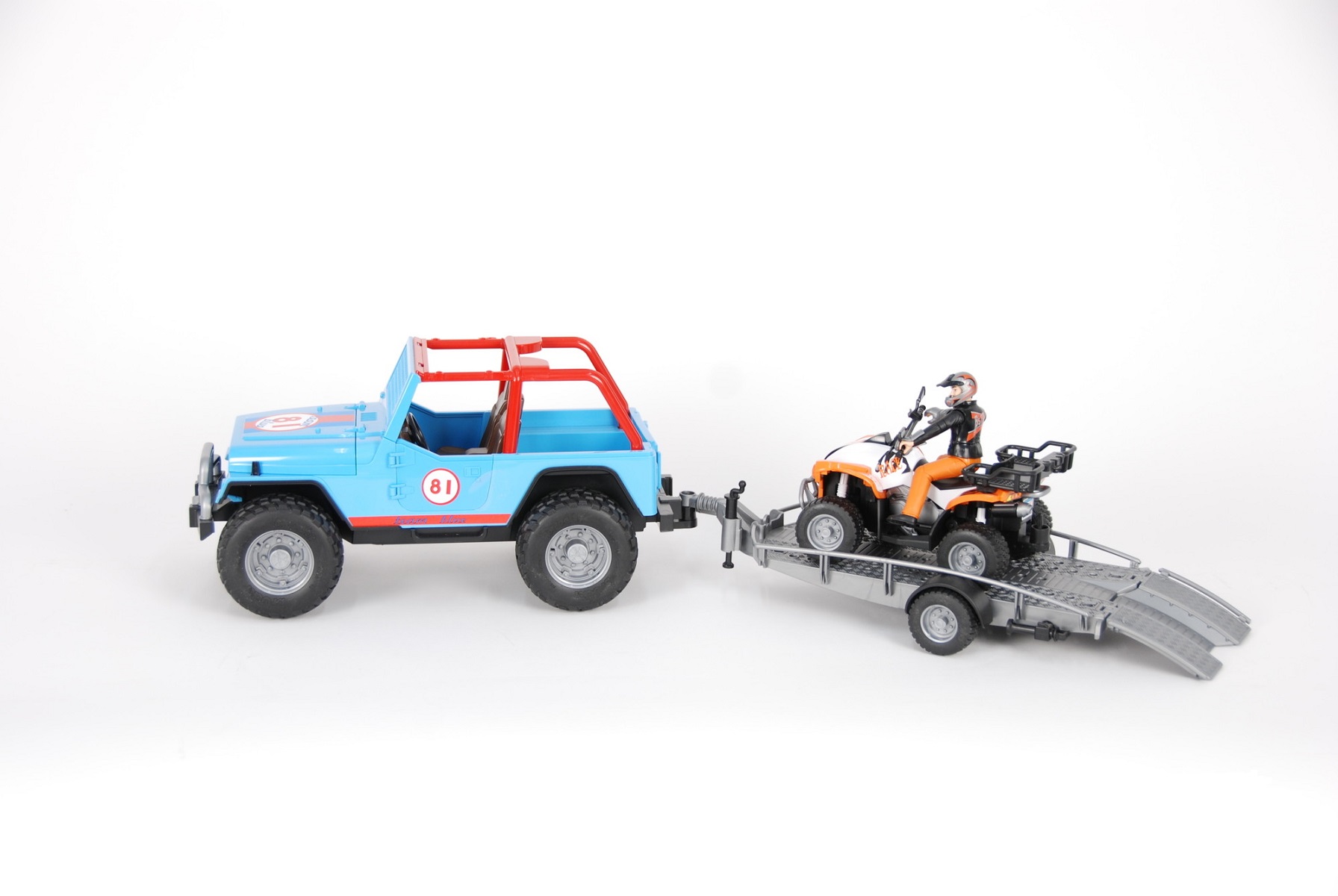En savoir +La Jeep Cross Country racer bleue avec capot ouvrant et portes avants ouvrantes possède un Quad avec suspension. Une remorque avec passerelle amovible permettra de faire monter le véhicule . Ainsi le conducteur pourra transporter son quad pour partir à l'aventure !