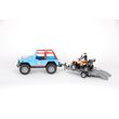 La Jeep Cross Country racer bleue avec capot ouvrant et portes avants ouvrantes possède un Quad avec suspension. Une remorque avec passerelle amovible permettra de faire monter le véhicule . Ainsi le conducteur pourra transporter son quad pour partir à l'aventure !