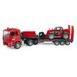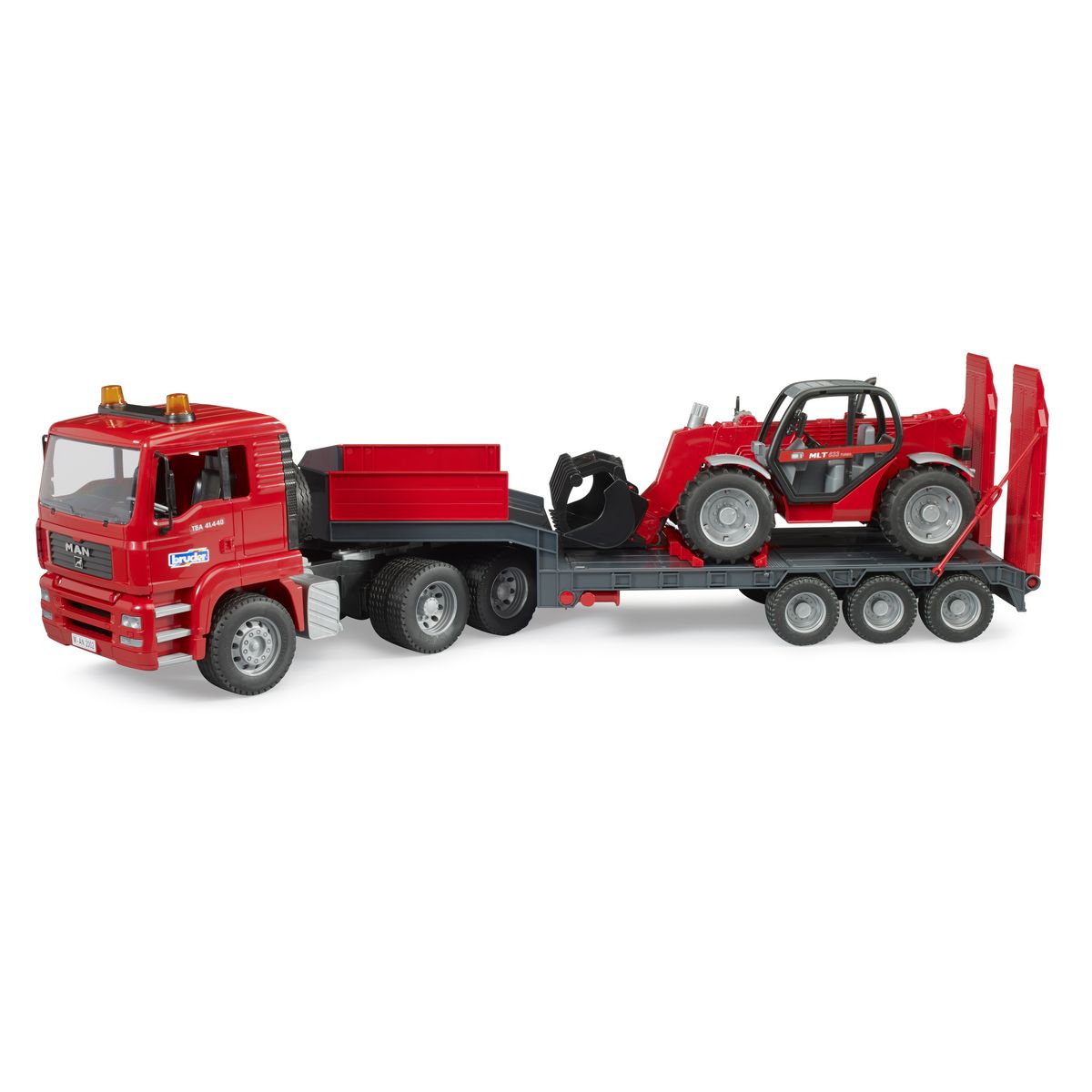 Découvrez le Camion surbaissé MAN TGA avec chargeur télescopique Manitou de la marque Bruder, un modèle réaliste à l'échelle 1:16. Ce jouet pour enfants à partir de 3 ans est idéal pour les jeunes passionnés de construction. Le camion est équipé d'une remorque surbaissée adaptée au transport de mach