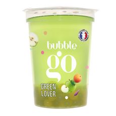 Thé vert (76,2%) ( eau, extrait de thé vert 0,2%), perles aux jus de pêche et pomme (11,9%) (eau,fructose, jus de pomme verte 1,0%, jus de pêche 1,0%, amidon,acidifiants : E327, E 330, antioxydant : E300, arôme pêche, arôme pomme verte, épaississant : E415, extrait d'algue, colorants : E140-E160a, arôme naturel, conservateur : E202), sirop de pomme verte (11,9%) (sirop de sucre inverti, eau, jus concentré de pomme (10%), arôme pomme verte, acidifiants : E296, E330, conservateur : E202 , colorant : E133).