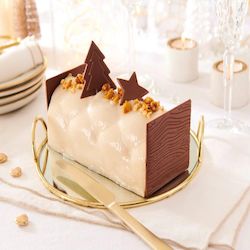 biscuit moelleux cacao, croquant chocolat noir, crémeux noisette et mousse à la noisette. Produit décongelé.