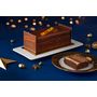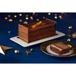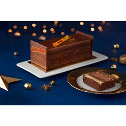 Bûche composée de génoises au cacao, d'un croustillant au chocolat au lait avec des morceaux de