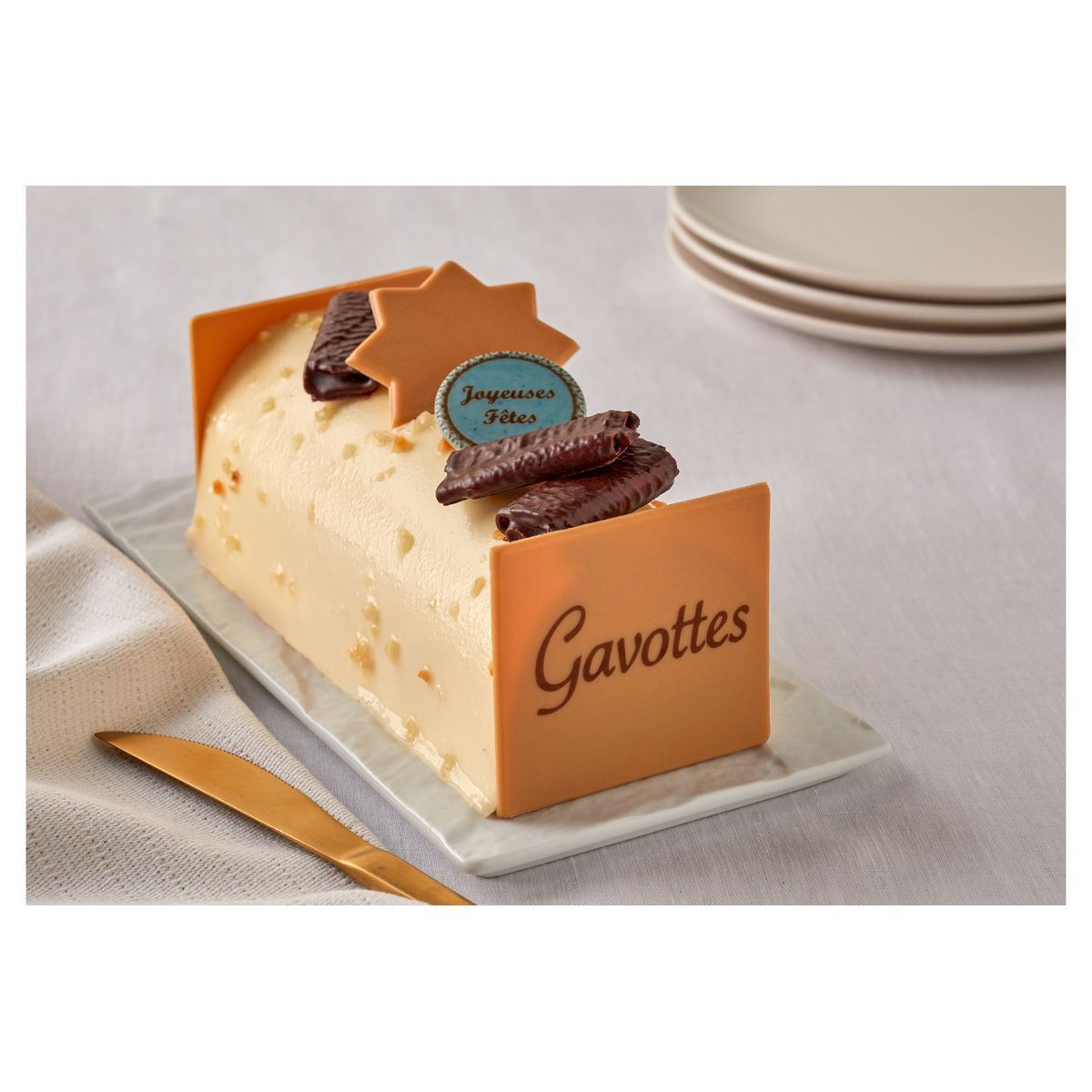 Ingredients :buche gavottes (CREME UHT (CREME, stabilisant : E407), chocolat blanc 13,46% (sucre, beurre de cacao, poudre de LAIT entier, poudre de LAIT ecreme, emulsifiant : lecithine de SOJA), sucre, eau, pate de NOISETTE 5,7%, chocolat de couverture au LAIT 5,57% (sucre, beurre de cacao, poudre de LAIT entier, pate de cacao, emulsifiant : lecithine de SOJA, arome naturel de vanille), blanc d'OEUF, jaune d'OEUF, brisures de crepes dentelle 3,42% (farine de BLE, sucre, BEURRE patissier, LACTOSE et proteines de LAIT, sel, extrait de malt d'ORGE, poudre a lever : E500i), chocolat blanc 2,74% (sucre, beurre de cacao, poudrede LAIT entier, emulsifiant : lecithine de SOJA, arome naturel de vanille), sirop de glucose, caramel au BEURRE demi sel AOP d'Isigny 2,7% (sirop de glucose fructose, LAIT concentre sucre, BEURRE demi sel AOP dIsigny, sucre, eau, sel), farine de BLE, fourrage au praline 2,51% (praline 93% (sucre, NOISETTE, AMANDE), huile de tournesol, sucre, emulsifiant : lecithine de SOJA), poudre d'AMANDE 1,69%, BEURRE, poudre de LAIT entier, AMANDES hachees 0,42%, caramel 0,34% (saccharose, eau, antioxydant : E330, antimoussant : E471), gelifiant (E440i, dextrose), poudre de blanc d'OEUF (blanc d'OEUF, agent moussant : E1505), amidon de mais, gelifiant (E440i, saccharose), sel (sel, antiagglomerant : E535), arome naturel de caramel), decor chocolat 4% (sucre, beurre de cacao, poudre de LAIT entier, emulsifiant : lecithine de SOJA, vanille naturelle, poudre de cacao, colorant : concentre de spiruline et pomme )