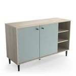Panneaux de particules 15 mm. Structure en papier décor Kronberg / Portes en mélamine vert de gris mat. 3 niches : dim. L. 28,5 x P. 38,7 x H. 17,1 cm, poids supporté : max. 4kg. 2 portes avec une étagère réglable sur 3 niveaux : dim. L. 77,2 x P. 36,3 cm, poids supporté : max. 12kg. 1 poignée bouton plastique. 5 pieds plastiques ronds laqué noir H. 12 cm. Optimisation logistique : tient sur une palette Europe.