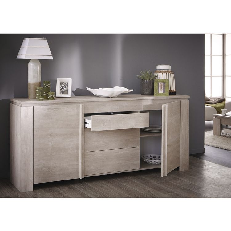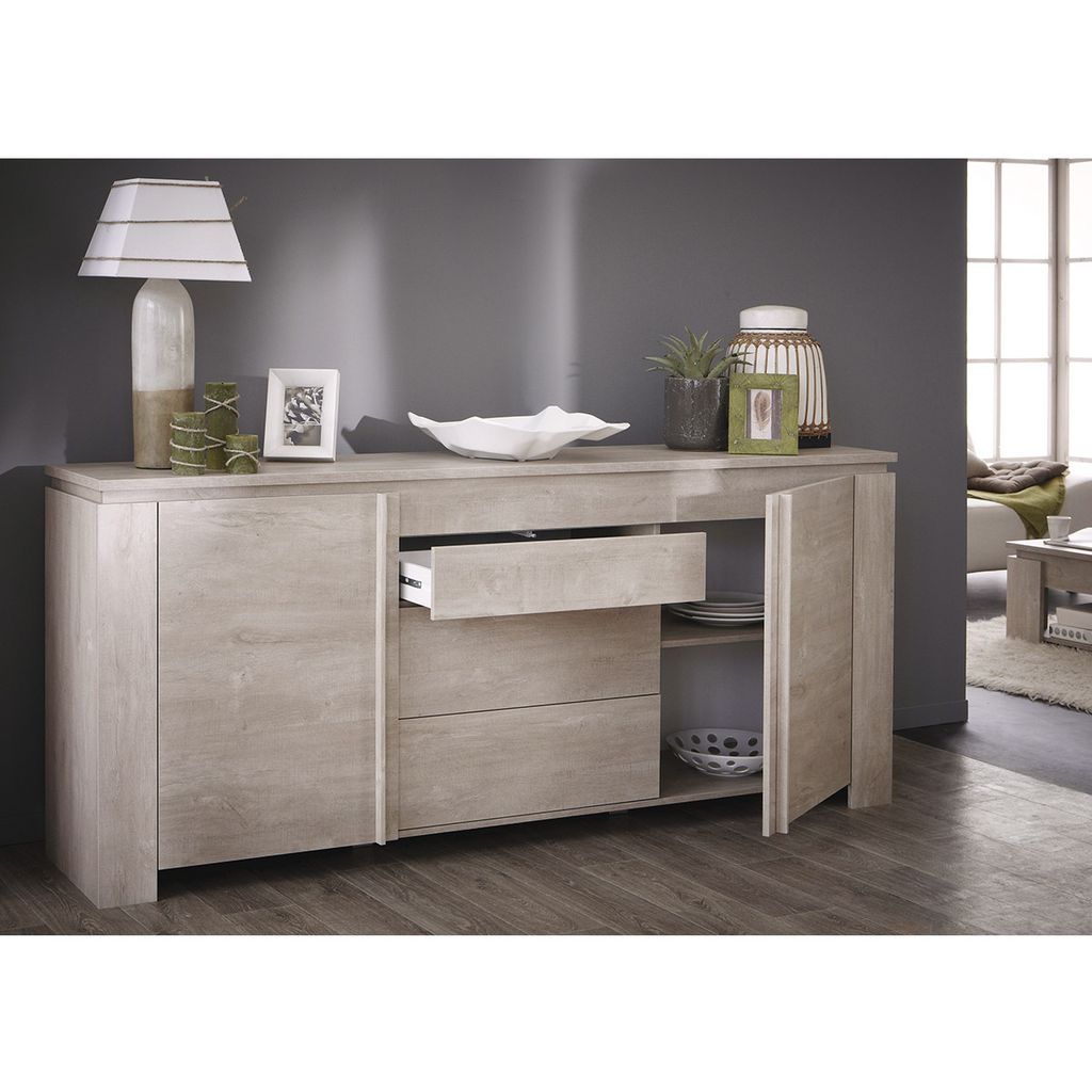 Buffet avec un revêtement en panneaux de particules mélaminé coloris chêne clair grisé, composé de 2+1 tiroirs montés sur coulisses métal (dimensions utiles: 64x7x32cm, 64x11x32cm) et de 2 portes système d'ouverture "push" avec 1 rayon réglable intérieur derrière chaque porte. Poignées profil MDF enrobé. Dessus en 22mm.