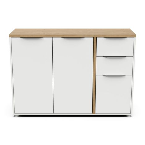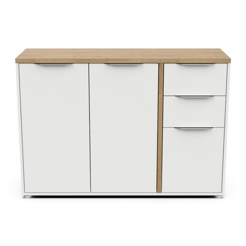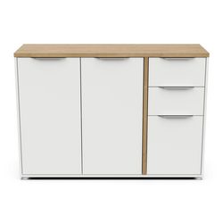 L'enfilade ACCESS de DEMEYERE allie esthétique contemporaine et praticité avec son décor chêne Hamilton et blanc mat. Ses 3 portes et 2 tiroirs offrent un équilibre parfait entre rangement discret et accès rapide, idéal pour les espaces de vie modernes.