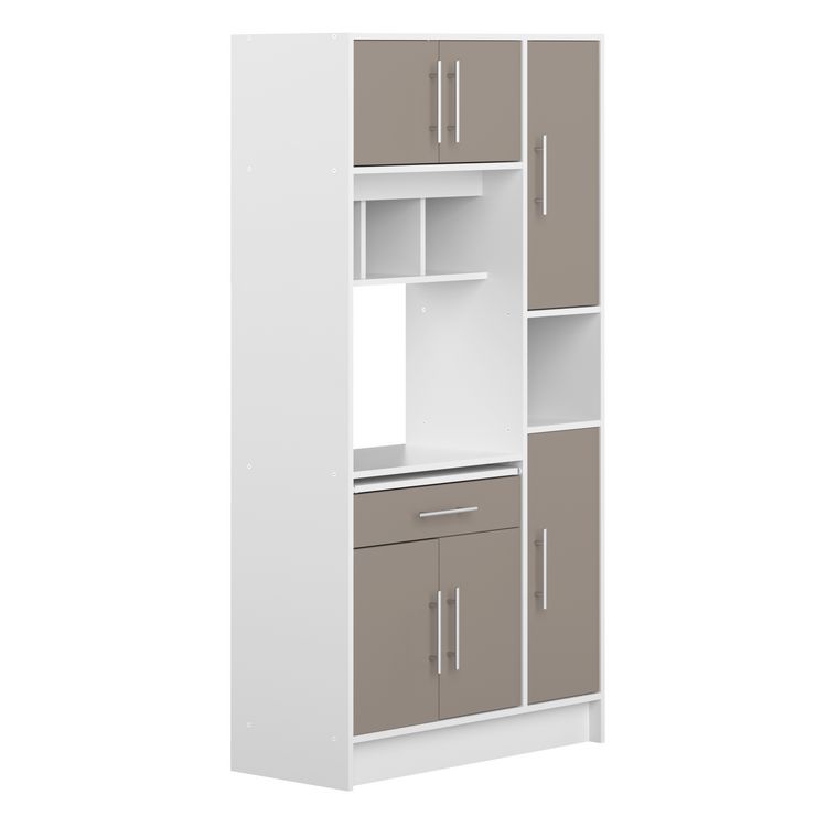 Cinq niches ouvertes dont une pour le micro-ondes / Tablette coulissante / Un tiroir monté sur coulisses à billes / Deux grand espaces de rangement fermés par deux portes / Deux espaces de rangement verticaux fermés par une porte / Fabriqué en France / Eco-responsable / Emballage renforcé