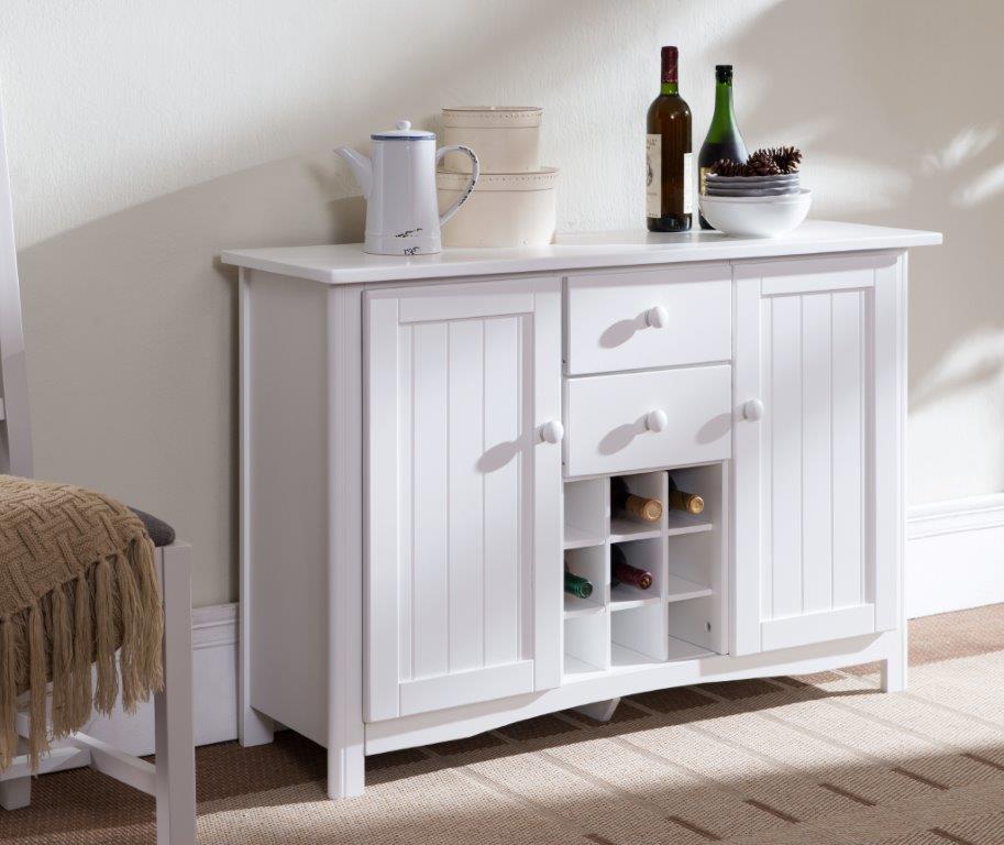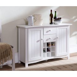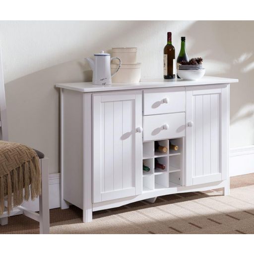 Le buffet de cuisine en bois massif CUISTOT à de quoi vous plaire ! Avec sa structure en pin massif laqué c'est un meuble solide et robuste. Il offre de nombreux rangements : 1 étagère derrière les deux portes offrant à chaque fois deux compartiments de rangement, 2 tiroirs et un range bouteille en
