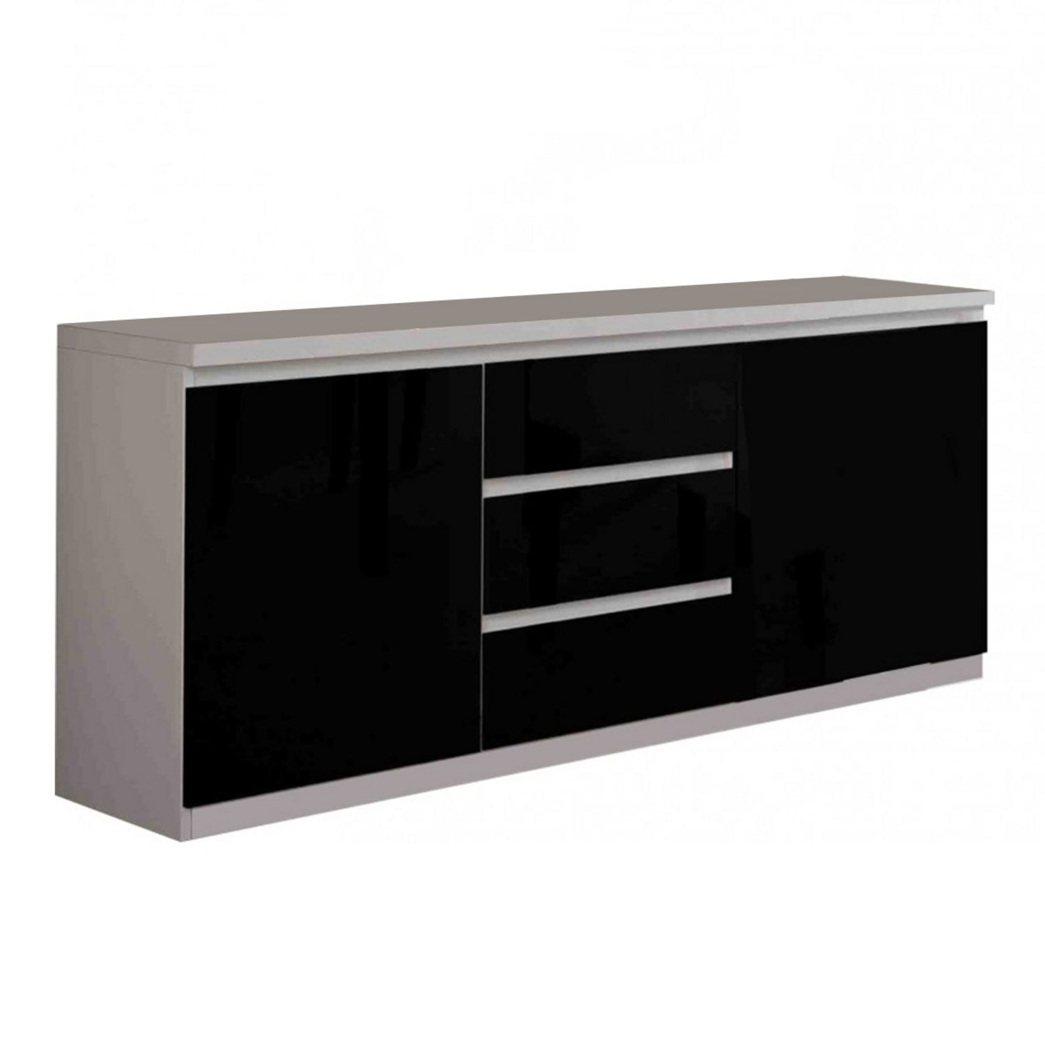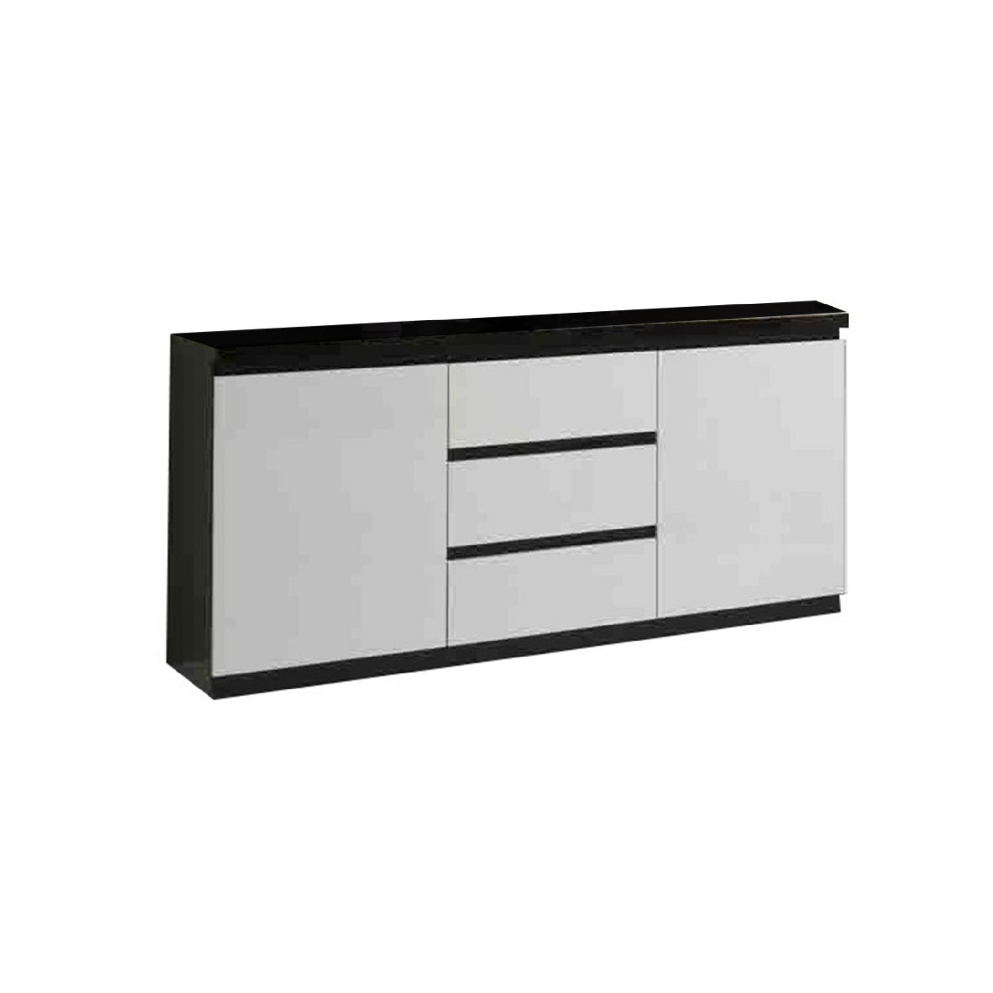 Buffet de salle à manger bicolore moderne laqué blanc/noir, noir/blanc et blanc/gris composé de 2 portes et 3 tiroirs. Ce magnifique buffet bicolore allie modernité et fonctionnalité. Le mariage de ses 2 coloris en font un buffet ultra tendance, sobre mais très chic ! Rangements et élégance seront présent. Une laque brillante diffusera luminosité et charme au cœur de votre pièce. Éblouissez vos invités ! A monter soi-même grâce à la notice de montage fournie. Structure : Panneaux de particules. Finition : Laque brillante. Dimensions : L165 x H83 x P50 cm.