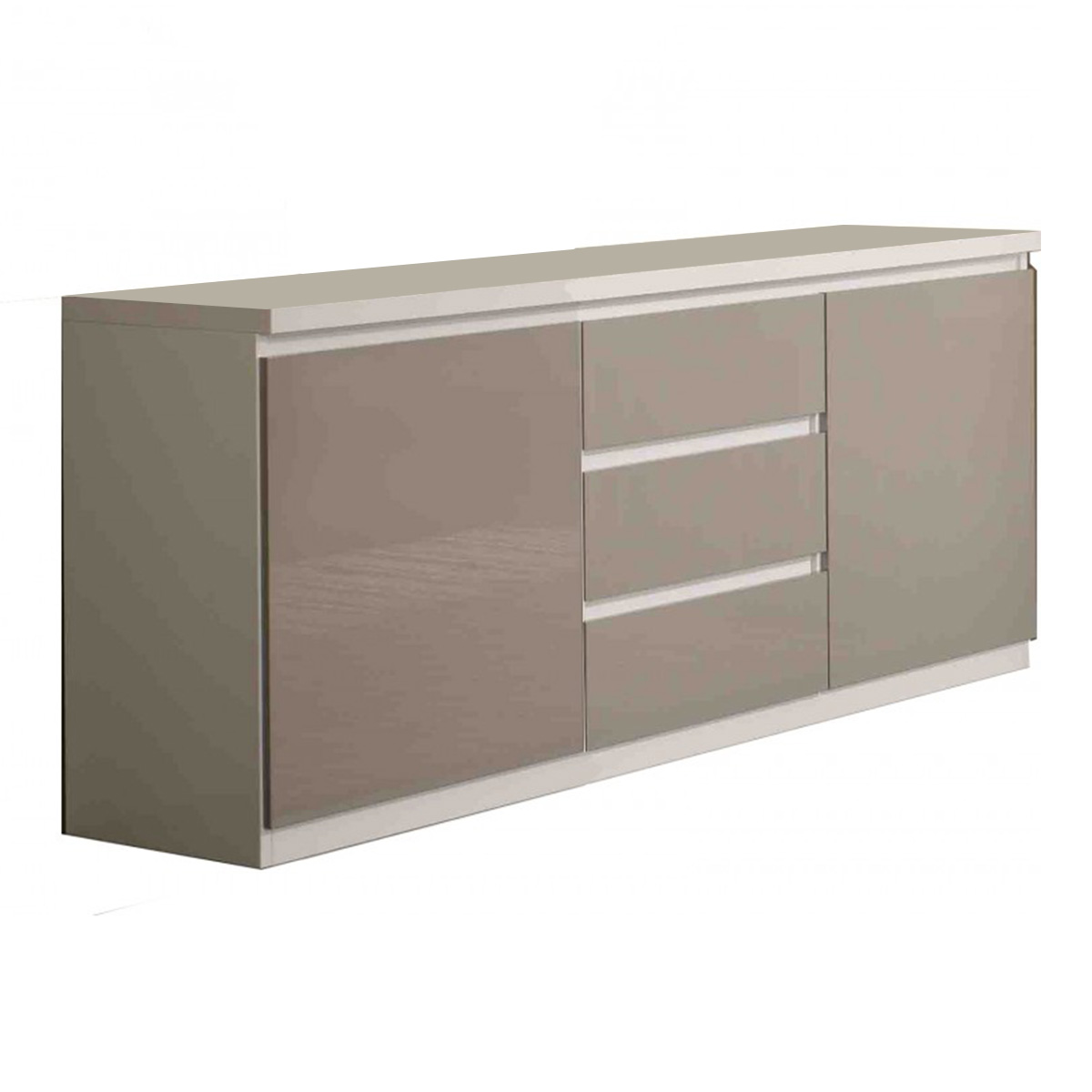 Bahut dressoir 2 portes battantes, 2 étagères en agglo 3 tiroirs, avec une structure en panneaux de particules agglomérés écologiques E1 épaisseurs 18 mm (structures, étagères) et 38 mm (dessus), laqué (laquage+vernissage à rayons ultraviolets).