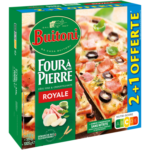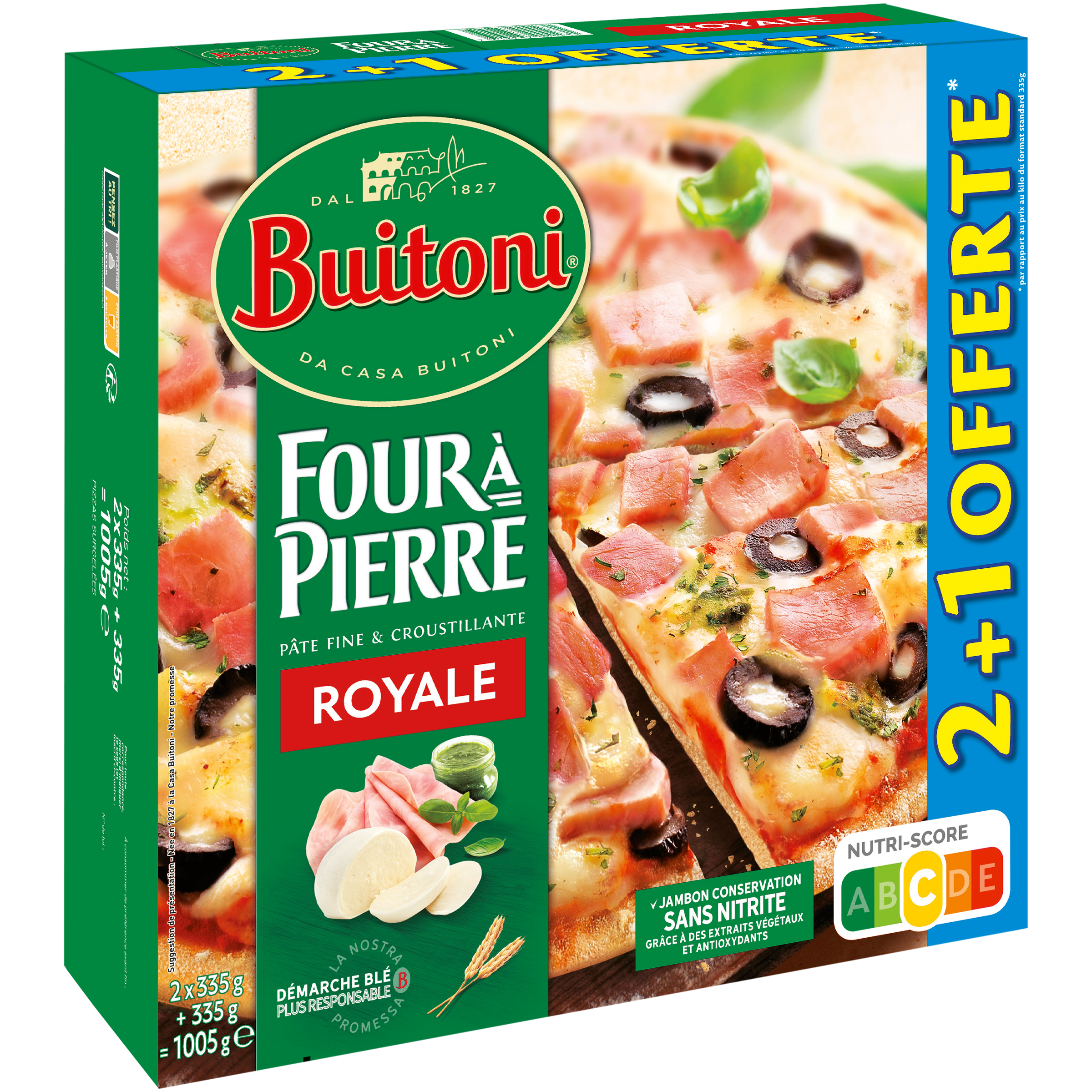 FOUR A PIERRE de BUITONI, c'est une pâte préparée comme en Italie : lentement pétrie, finement étalée puis une pizza directement cuite sur pierre. Le résultat : une pâte à la fois moelleuse et croustillante ! Découvrez Four à Pierre Royale : de généreux morceaux de jambon CONSERVATION SANS NITRITE, du fromage fondant, des olives noires et une délicieuse sauce façon pesto.