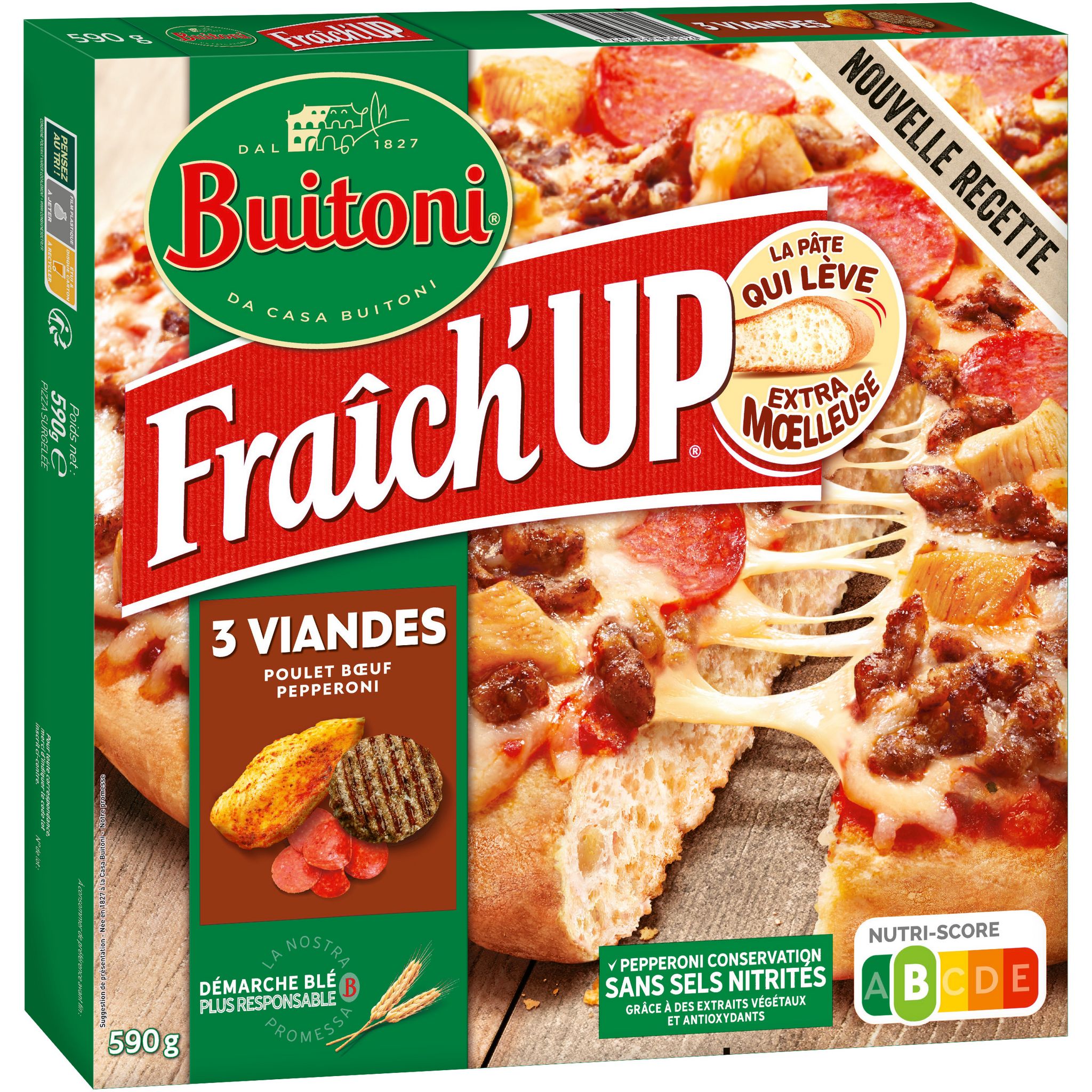 Pizza surgelée à la viande - Garniture aromatisée La pâte à pizza unique de la pizza FRAICH'UP de BUITONI lève sous vos yeux dans votre four en dégageant une bonne odeur de pain chaud… pour un résultat extra-moelleux et légèrement croustillant ! Amateurs de viande ? Dégustez une recette originale et ultr