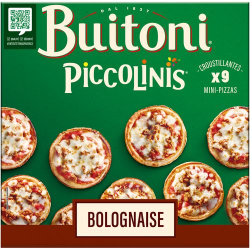 Laissez-vous tenter par les mini-pizzas PICCOLINIS de BUITONI : des petites pizzas surgelées, à la pâte croustillante et à la garniture généreuse ! Gourmandes, savoureuses et prêtes en quelques minutes seulement. Ces mini-pizzas sont composées de viande hachée 100% pur boeuf cuisinée avec des oignons, le tout accompagné d'un délicieux fromage ! BUITONI s'engage en toute transparence. Aujourd'hui, plus que jamais, nous mettons tout notre savoir faire au service de la qualité et de la sécurité de tous nos produits. Plus d'informations sur Buitoni.fr