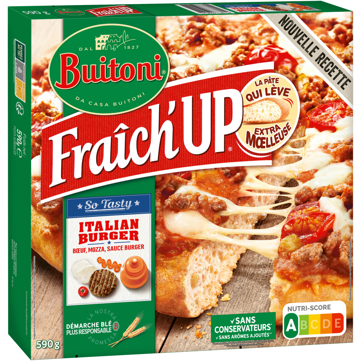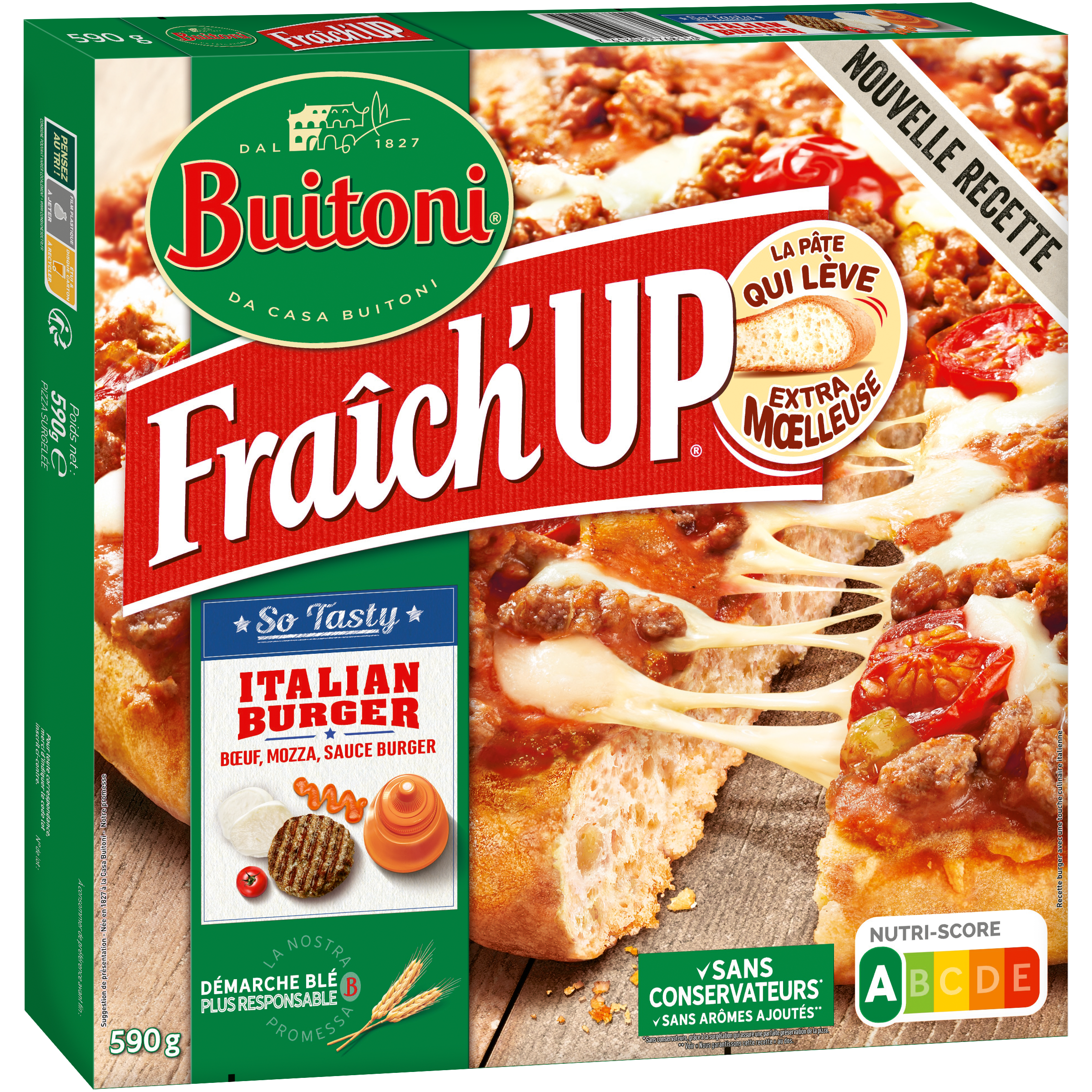 Pizza surgelée - Garniture aromatisée FRAICH'UP LITTLE ITALY de BUITONI est inspirée de la combinaison du savoir-faire ancestral des pizzaïolos italiens et de l’audace et la modernité culinaire de New-York. Ce sont des garnitures gourmandes, généreuses et originales, sublimées par des sauces
