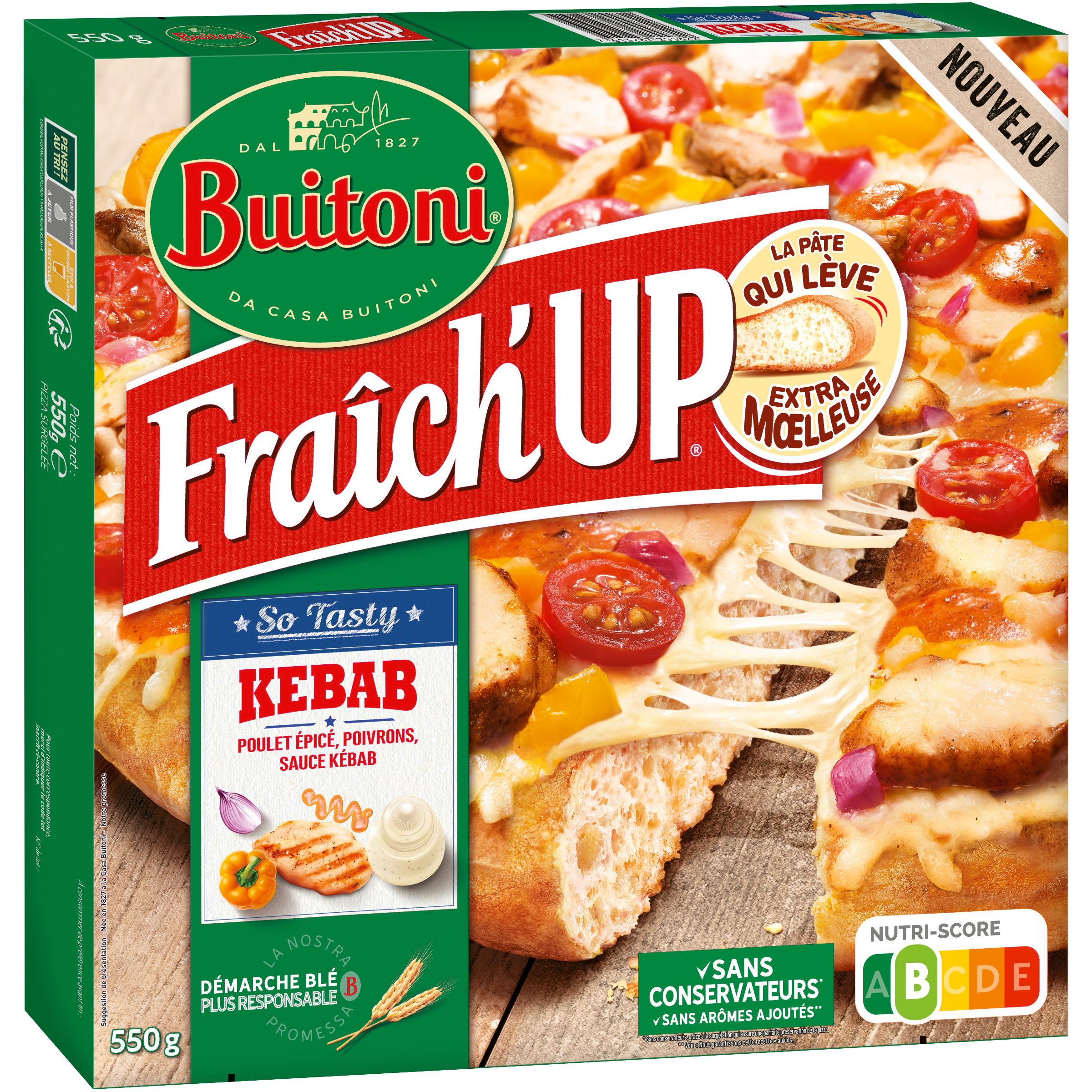 Ingrédients: Farine de BLE 32,8%, eau, filets de poulet cuits aux épices kébab 7,5% (filet de poulet (non-UE), épices et plantes aromatiques, sel, huile de colza, dextrose), CREME (LAIT), EDAM (LAIT), MOZZARELLA (LAIT), tomates cerise, poivrons jaunes 3,2%, oignons rouges 3%, sauce façon kébab 2,6% (eau, CREME (LAIT), FROMAGE blanc 0% (LAIT), huile de tournesol, épices et plantes aromatiques, amidon modifié de pomme de terre, sel, pulpe d'ail), FROMAGE blanc 0% (LAIT), huile de tournesol, GLUTEN de BLE, levure, poudres à lever : tartrate de potassium, carbonates de sodium ; levain déshydraté (BLE), amidon modifié de pomme de terre, sel, sucre, farine de BLE dur, semoule de BLE, huile d'olive vierge extra, pulpe d'ail, épices et plantes aromatiques, agents de traitement de la farine : alpha-amylase, xylanase.