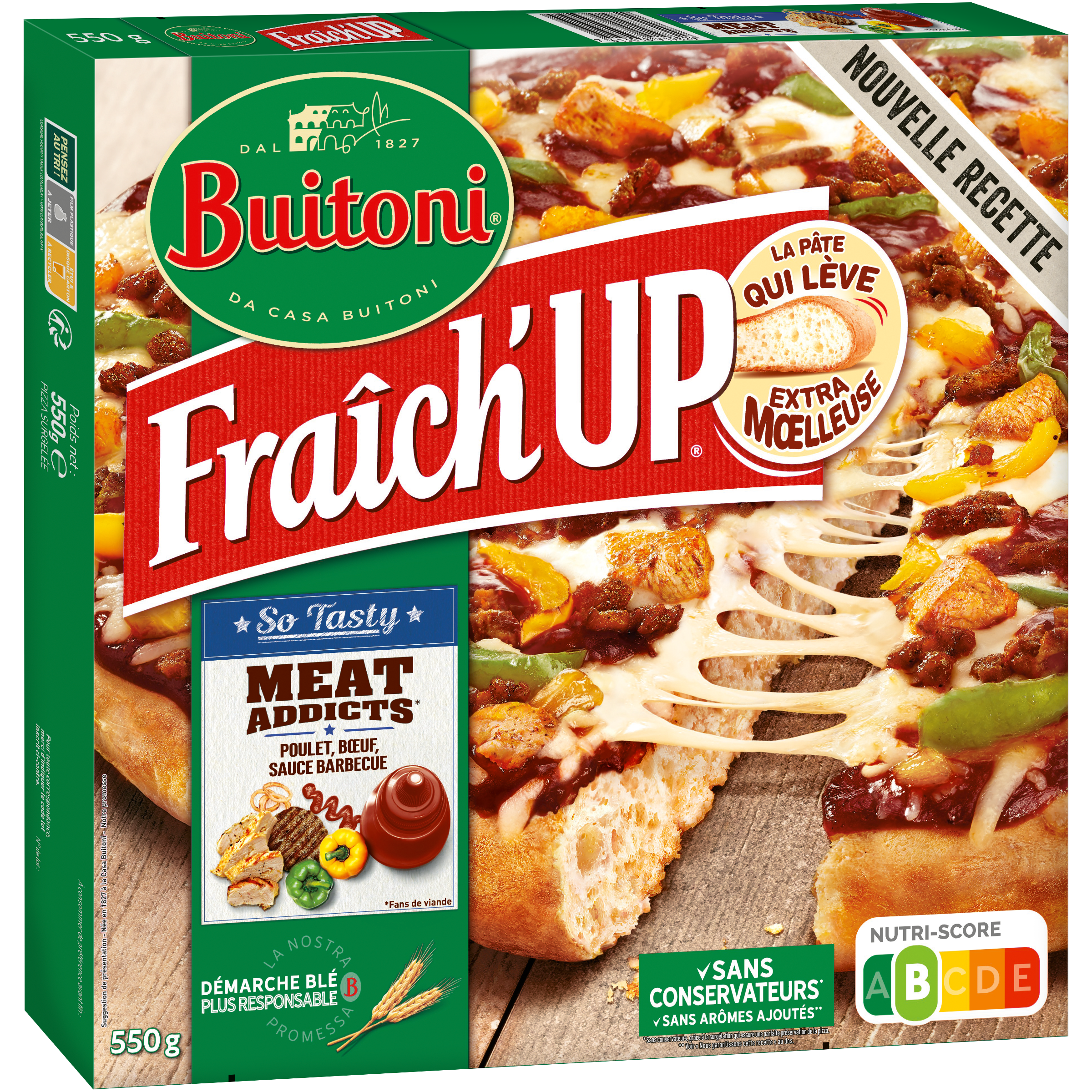 Pizza surgelée à la viande garniture aromatisée La pâte à pizza unique de la pizza FRAICH'UP de BUITONI lève sous vos yeux dans votre four en dégageant une bonne odeur de pain chaud… La gamme Little Italy vous offre des recettes toujours plus complexes et osées, ultra gourmandes, inspirées de la Vente à Emporter. La Meat Addicts vous propose une quantité généreuse de viandes et de fromages, associés à un mélange subtil de poivrons et d'oignons cuisinés, sur une base sauce BBQ ultra gourmande.