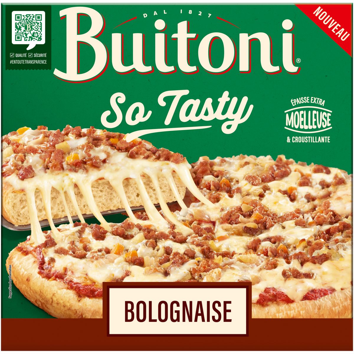 Laissez-vous tenter par la NOUVELLE recette de pizza BUITONI, SO TASTY, une pâte à pizza épaisse extra moelleuse et croustillante qui saura ravir petit et grand ! Cette pizza est composée de viande hachée 100% pur boeuf cuisinée avec des oignons frits, de petits dés de carottes, le tout accompagné de délicieux fromages ! BUITONI s'engage en toute transparence. Aujourd'hui, plus que jamais, nous mettons tout notre savoir-faire au service de la qualité et de la sécurité de tous nos produits. Plus d'informations sur Buitoni.fr