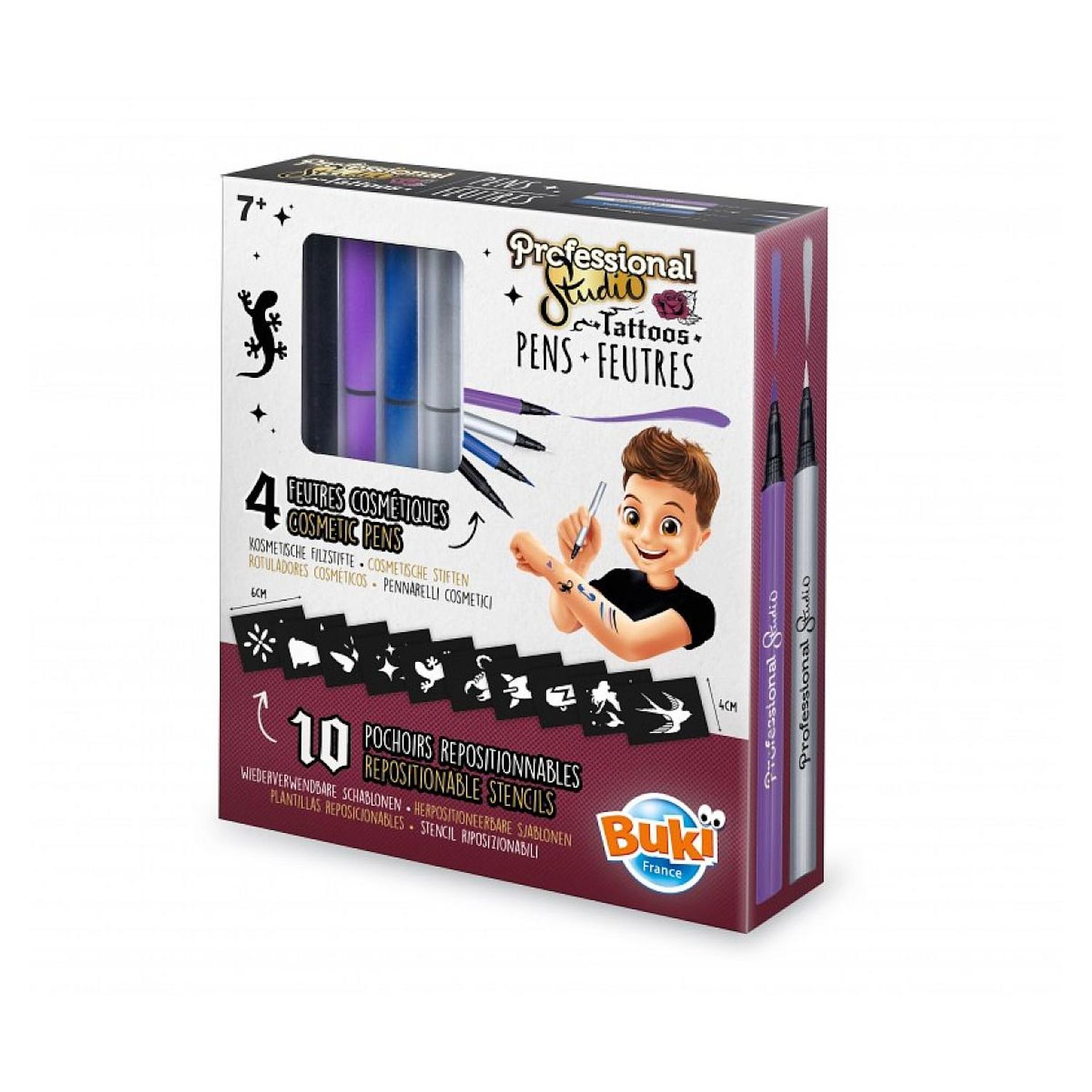 Ce coffret contient 4 feutres cosmétiques accompagnés de pochoirs pour s'amuser à créer de jolis maquillages éphémères en toute sécurité ! Faciles à utiliser et pensés pour les enfants, ces feutres permettent de réaliser des motifs ludiques et colorés sur le visage ou les bras grâce aux pochoirs inc
