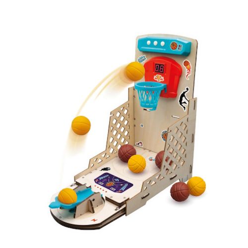 Un coffret pour monter son panier de basket électronique. Avec le tournevis inclus, l'enfant va assembler sans soudure et sans danger : le tableau des scores, le panneau de contrôle, le haut-parleur et le compartiment à piles. Personnalise le panier avec les autocollants. Le tableau électronique émet des sons à chaque panier, décompte le temps imparti et comptabilise les scores. Possibilité de jouer à 2 et de comparer ses scores.