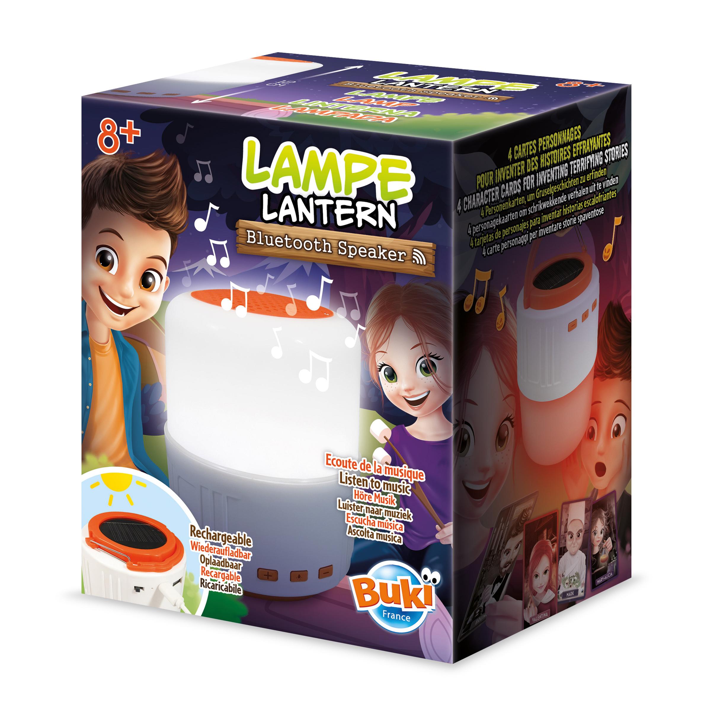 Une lampe de camping rechargeable avec une fonction enceinte Bluetooth. Elle se recharge grâce à son panneau solaire ou avec un câble USB. 3 modes d'éclairage. La lampe est également une batterie externe et peut recharger d'autres appareils électriques. Connecte un téléphone ou une tablette en bluetooth pour diffuser de la musique sur l'enceinte. Mode lumière rouge pour se raconter des histoires qui font peur. Quatre fiches avec des portraits de personnages effrayants inclus. Fonctionne avec une batterie lithium et un câble USB inclus. Cartes illustrées en couleurs. Dès 8 ans.